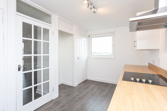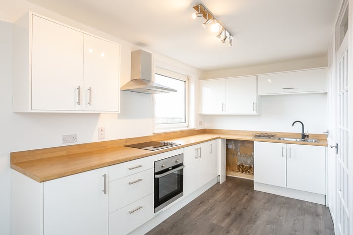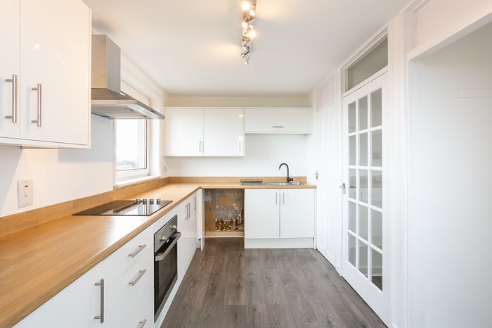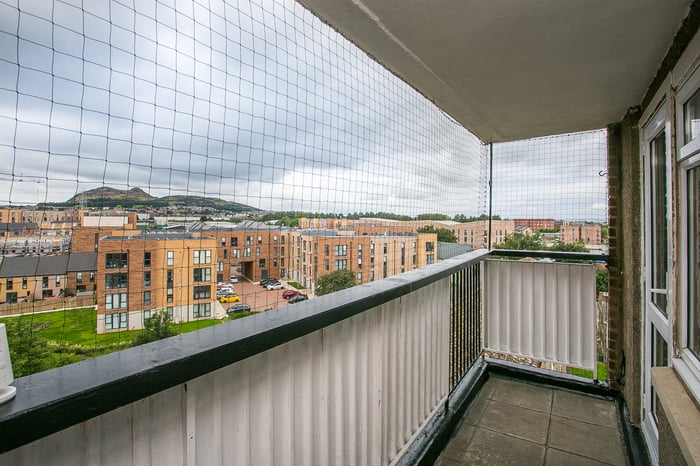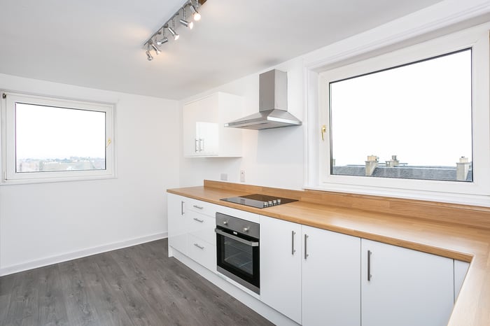 A spacious reception room, with a traditional fire surround, opens onto a southwest-facing balcony, enjoying far-reaching, open views of Arthur’s Seat. Offering a spacious, versatile floorplan, the bright living and dining room is conveniently connected to a kitchen, including built-in cupboard storage and fitted with contemporary, white units and wood-effect worktops.