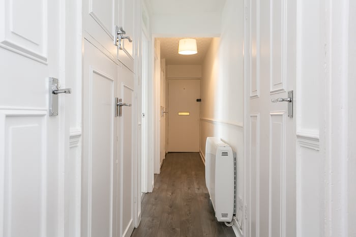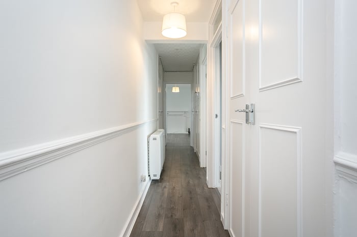 Beautifully presented and spacious, two-bedroom, triple-aspect, sixth-floor flat, with exceptional views of Arthur’s Seat and the Firth of Forth. Forming part of an established, residential development, located in the heart of Portobello, east of Edinburgh city centre. A bright entrance hall, with generous storage, is finished with modern, wood-effect flooring and fresh neutral decor, which continues throughout the flat.
