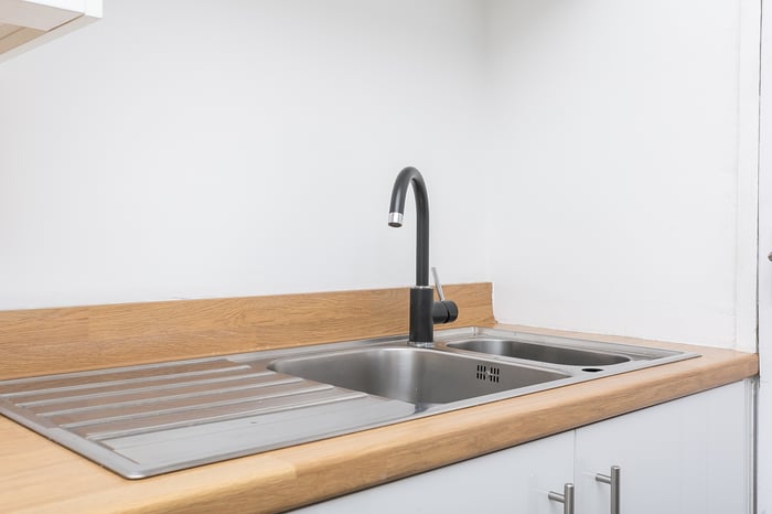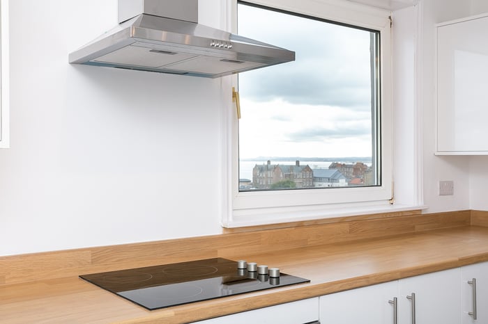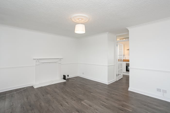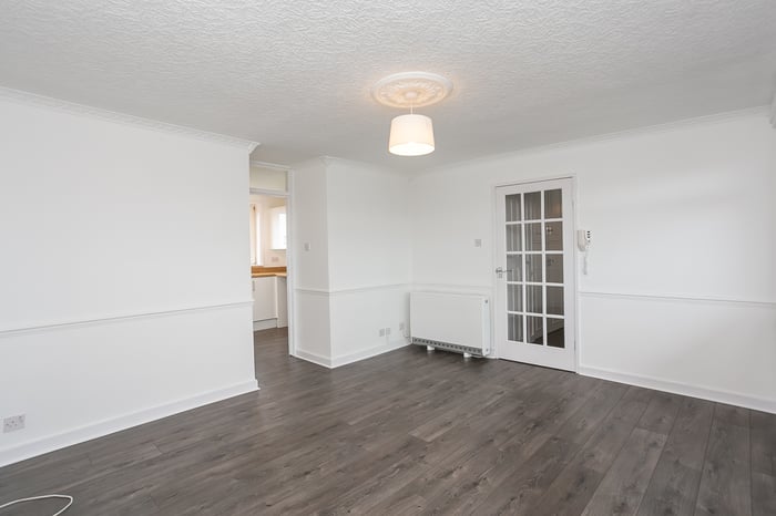 Appliances include an integrated oven, a ceramic hob and a stainless-steel canopy, whilst plumbing and space are available for further appliances. Two double bedrooms are bright and well-proportioned.