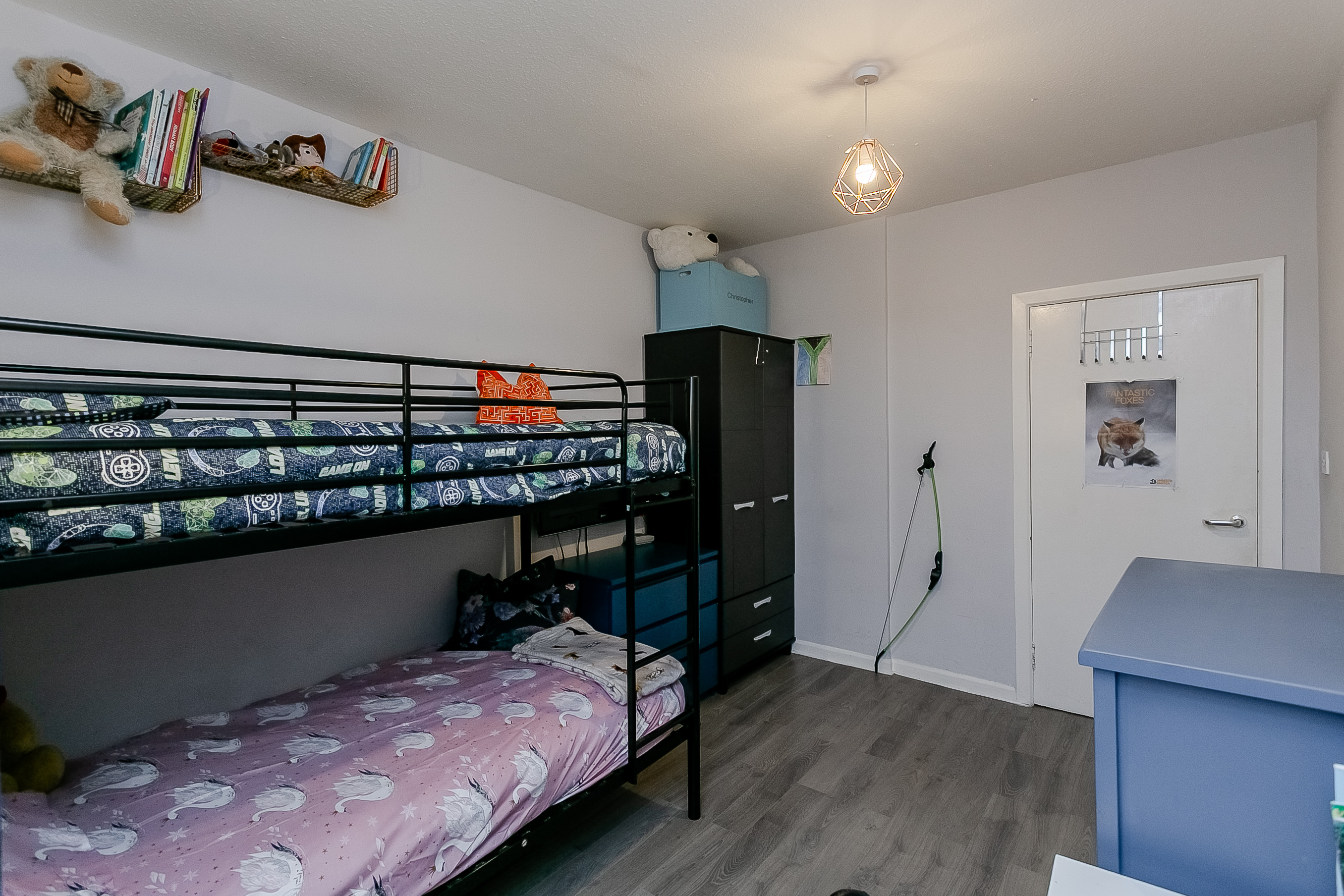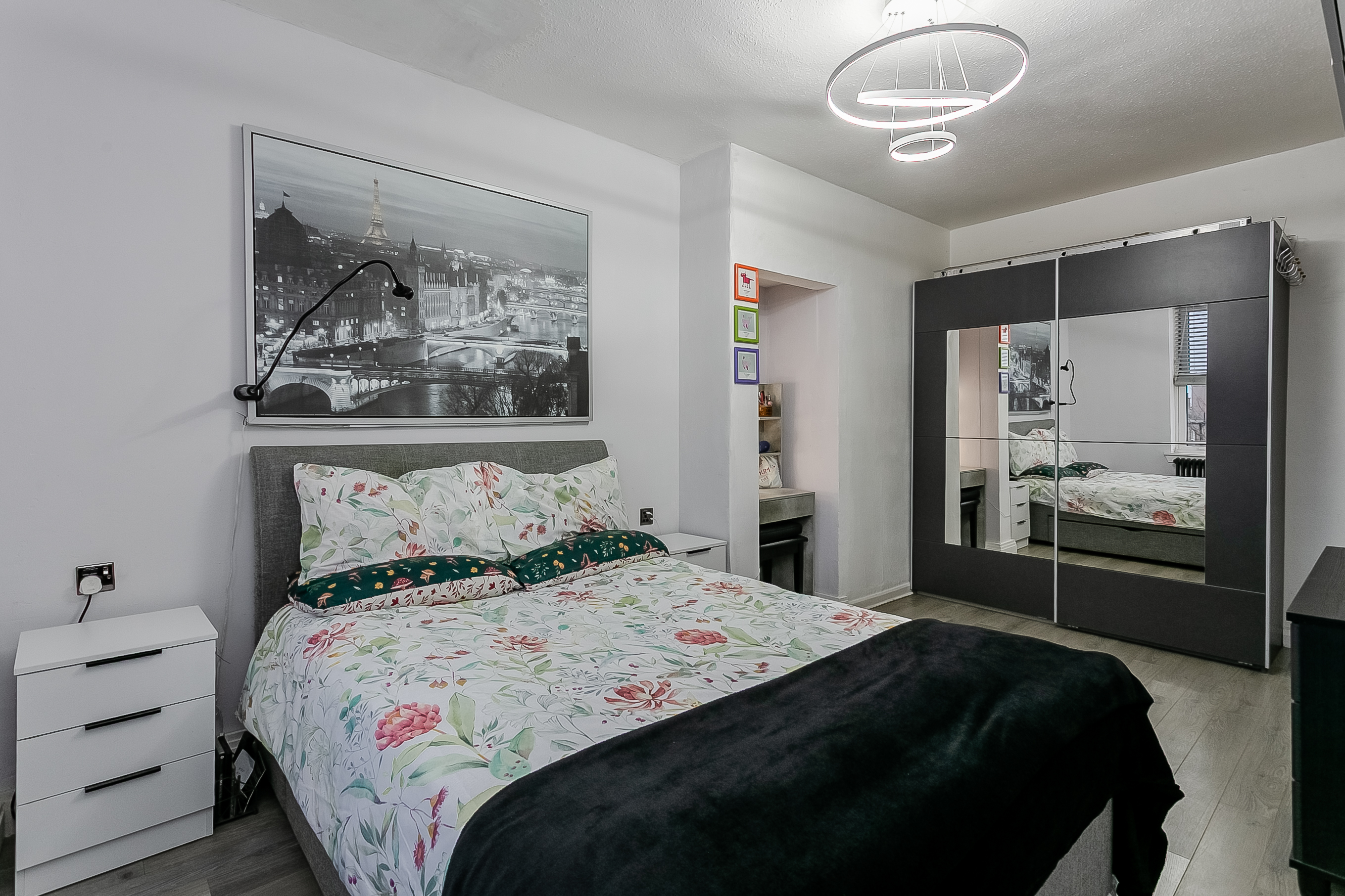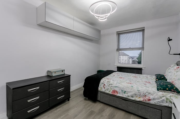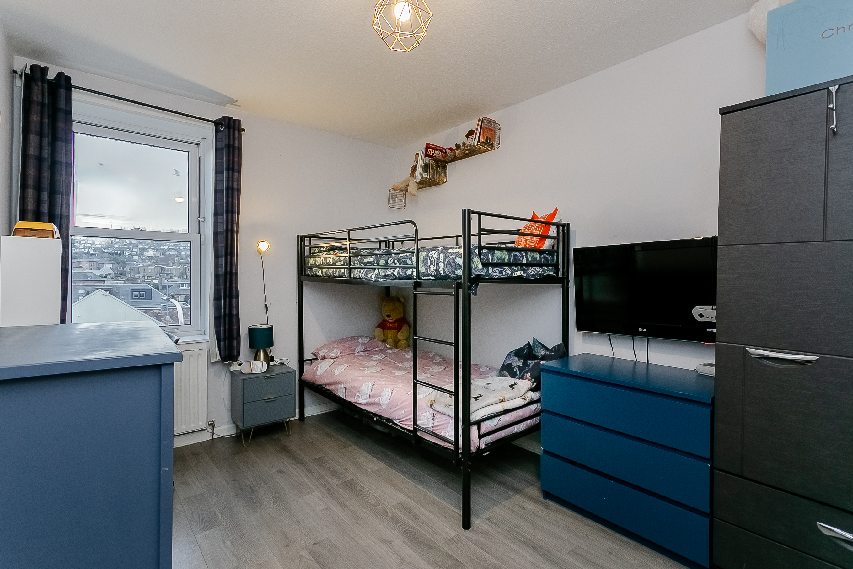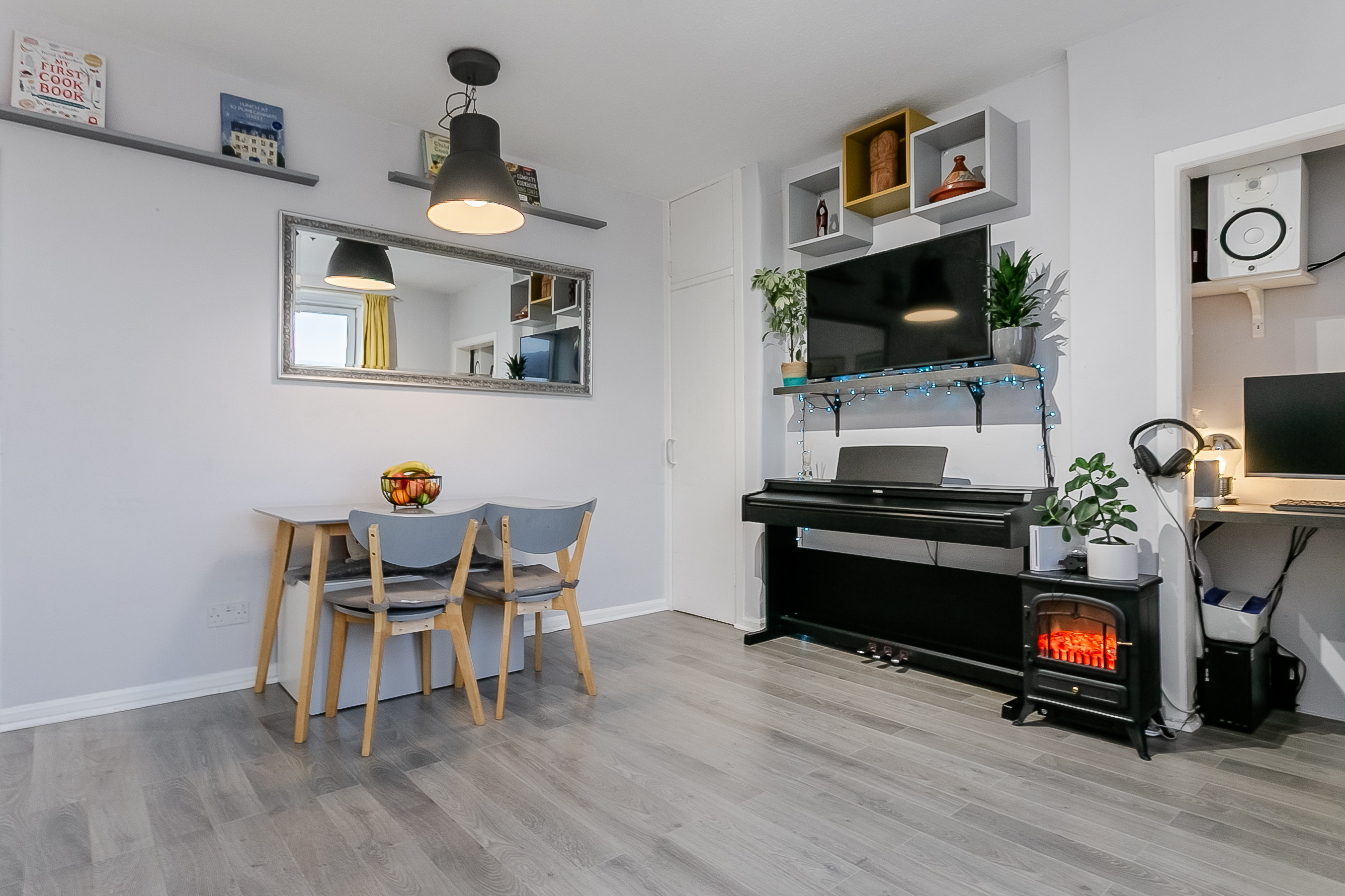 Beautifully presented, south-facing two-bedroom, dual-aspect third-floor (top) flat, with views to Arthur’s Seat. Forming part of an established residential development in the popular Piershill area, east of the city centre. A welcoming entrance hallway provides access to all rooms, leading into the living room, which features contemporary flooring throughout and a wall-mounted TV point, making it ideal for entertaining.