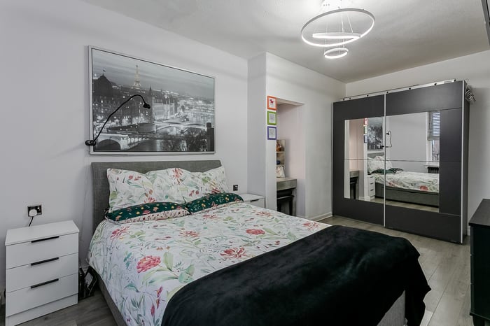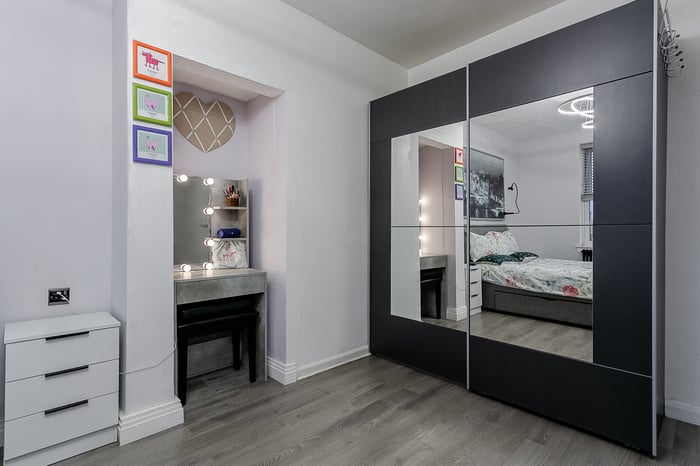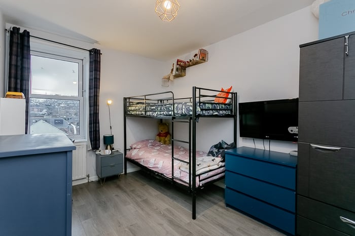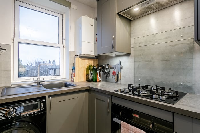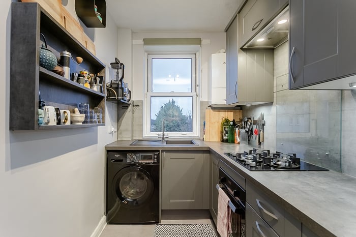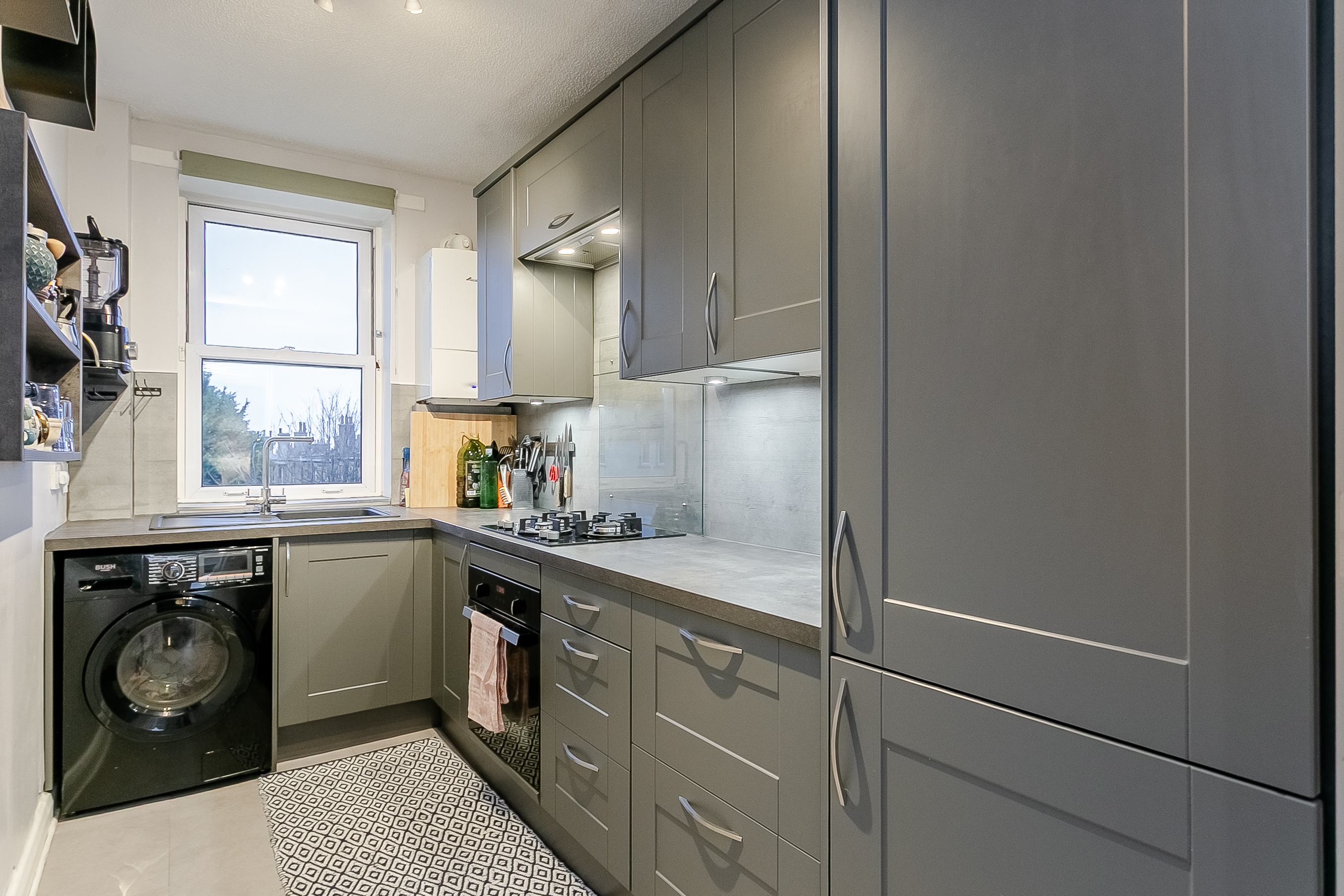 Opposite, the kitchen is finished with tiled-effect flooring and offers modern worktops, a stylish splashback, an integrated oven and gas hob with canopy above, as well as a washing machine and fridge/freezer. Towards the front of the property, bedroom two continues the contemporary flooring from the hallway and offers space for standalone furniture, while bedroom one also allows for free-standing furniture and benefits from a large window that fills the room with plenty of natural light throughout.
