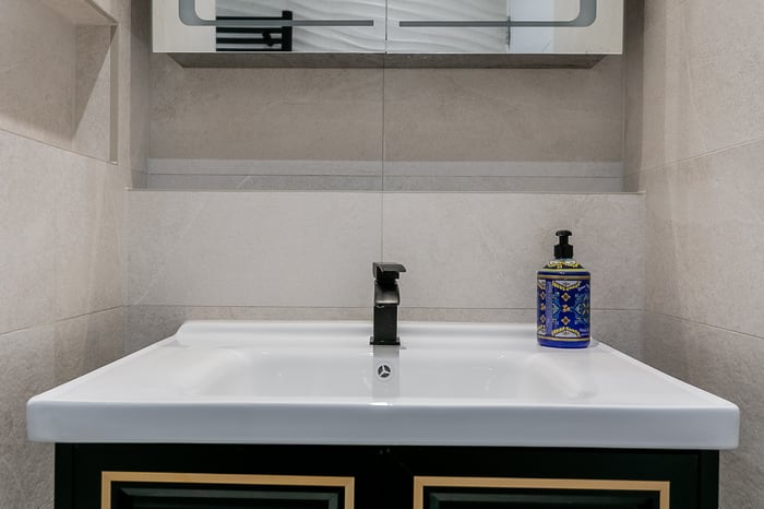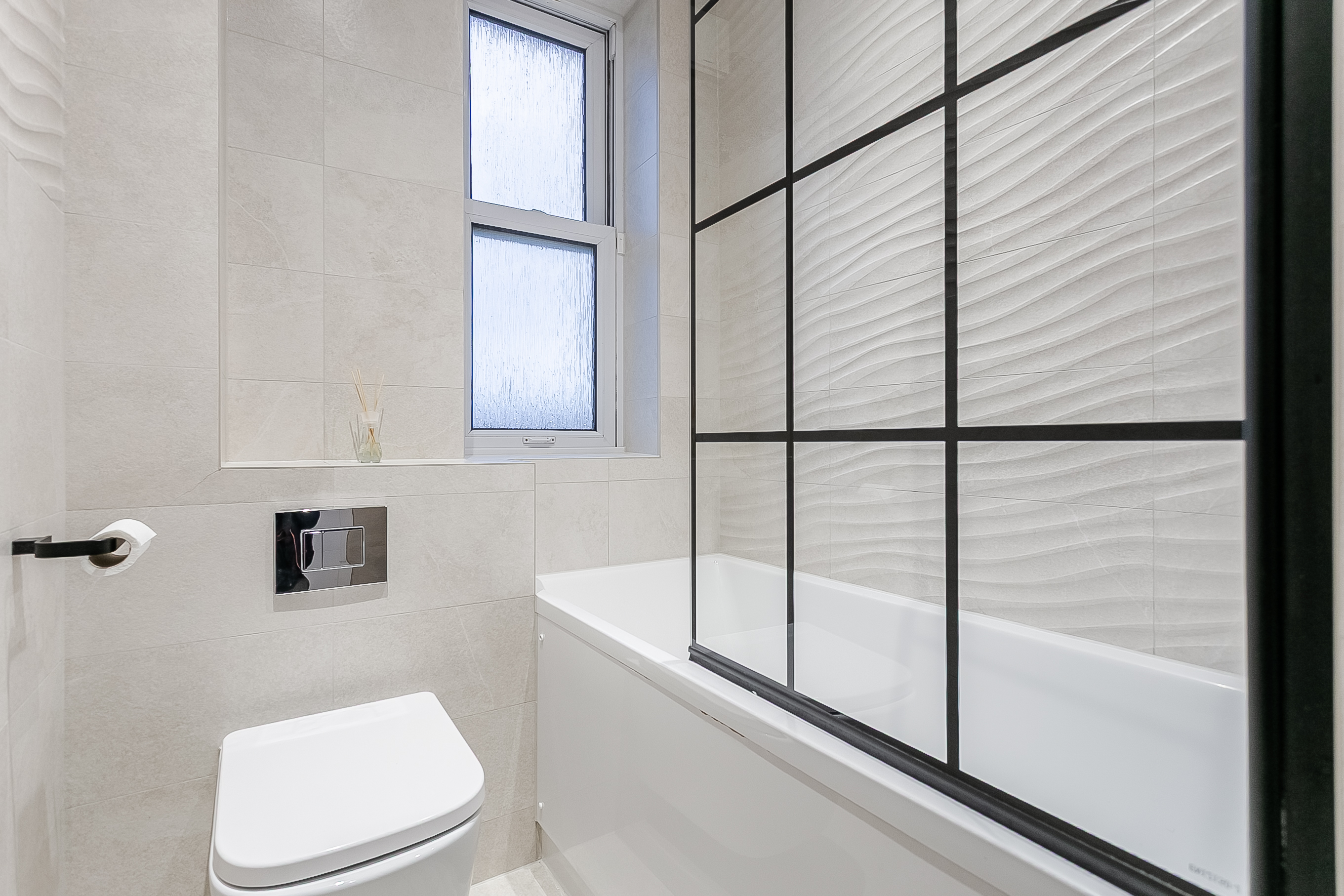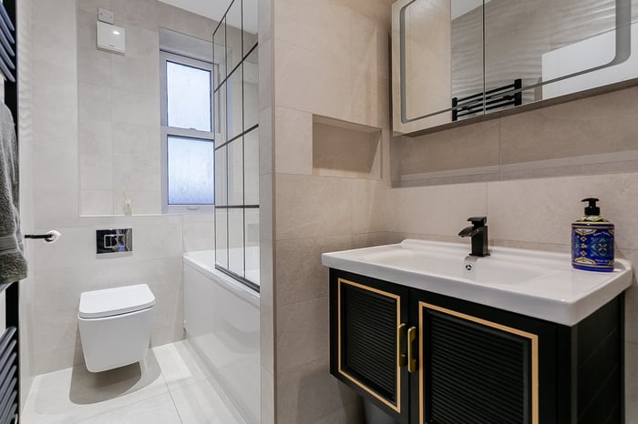 Completing the property is the family bathroom, fitted with a three-piece suite including both an electric and gas-powered shower over a bath, and a ladder-style radiator.