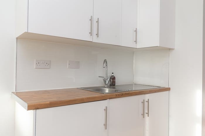 The main door access opens into a living room space which features recessed spotlights, space for outerwear, and ample space for lounge furniture. Open to the living room, the stylish kitchen is fitted with wall and base units, wood effect worktops, a sink with drainer and modern splashbacks.
