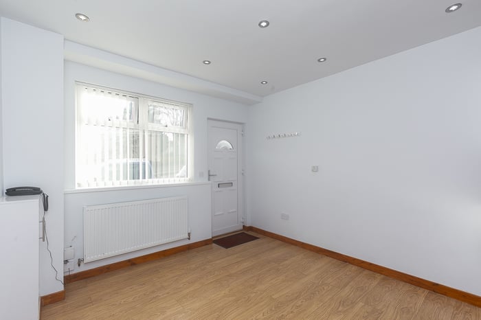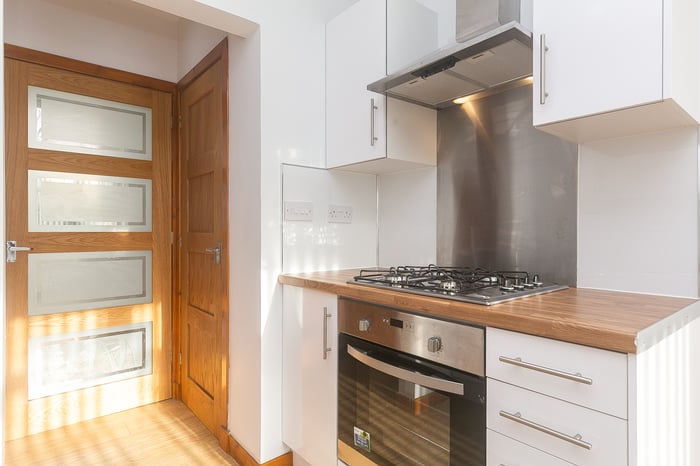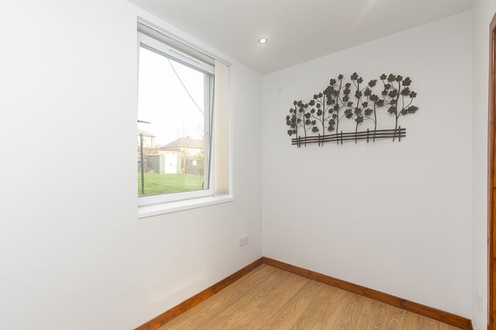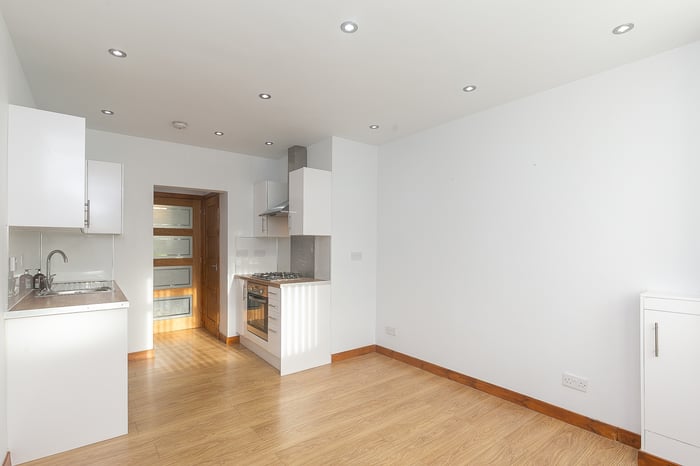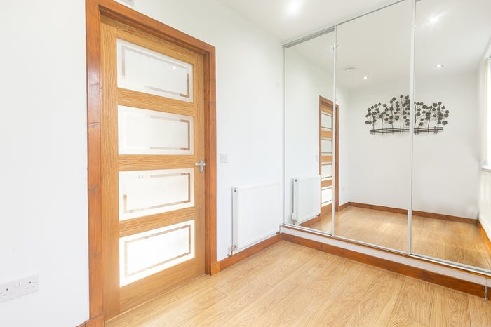Appliances include an integrated oven, a gas hob with an extractor hood above, and a washing machine; whilst a freestanding fridge/freezer is housed in the storage cupboard, set off the inner hall. Set to the rear of the property, with continuous wood effect flooring extending from the public room, the bedroom features recessed spotlights and a built-in wardrobe with mirror sliding doors.