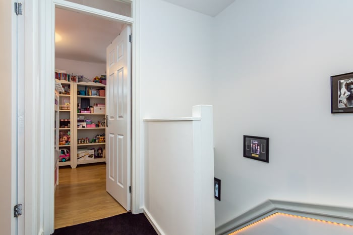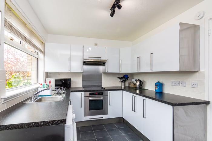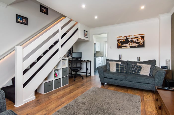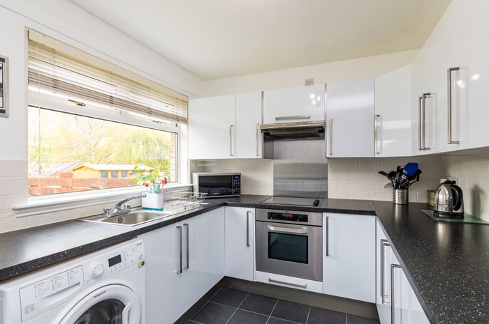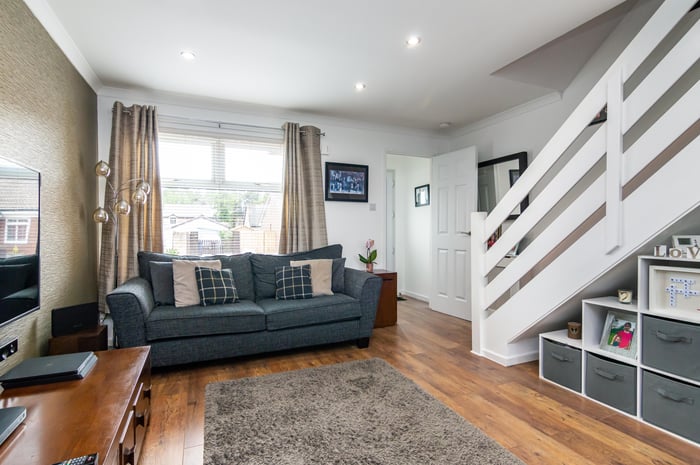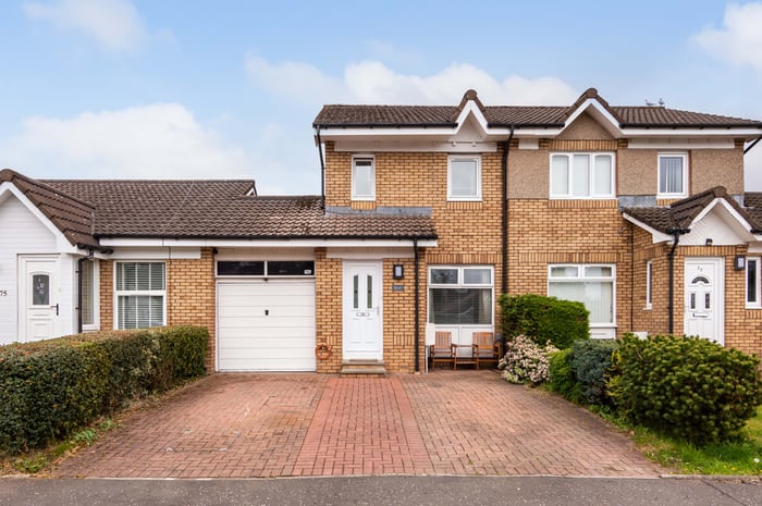 Beautifully presented, two-bedroom, linked semi-detached house with a driveway, garden and garage, set in a quiet residential area, located in Livingston, West Lothian. The entrance hall has a storage cupboard, and wood effect flooring extending through to the spacious, front-facing living room which features a TV wall mount, spotlights, the carpeted stairs leading up to the upper landing and ample space for lounge furniture.