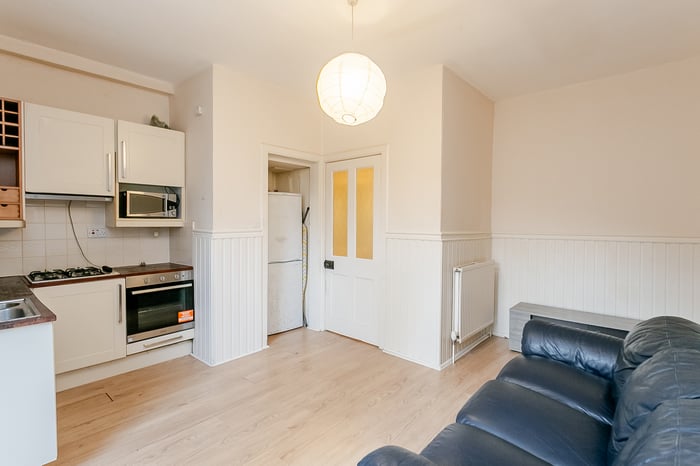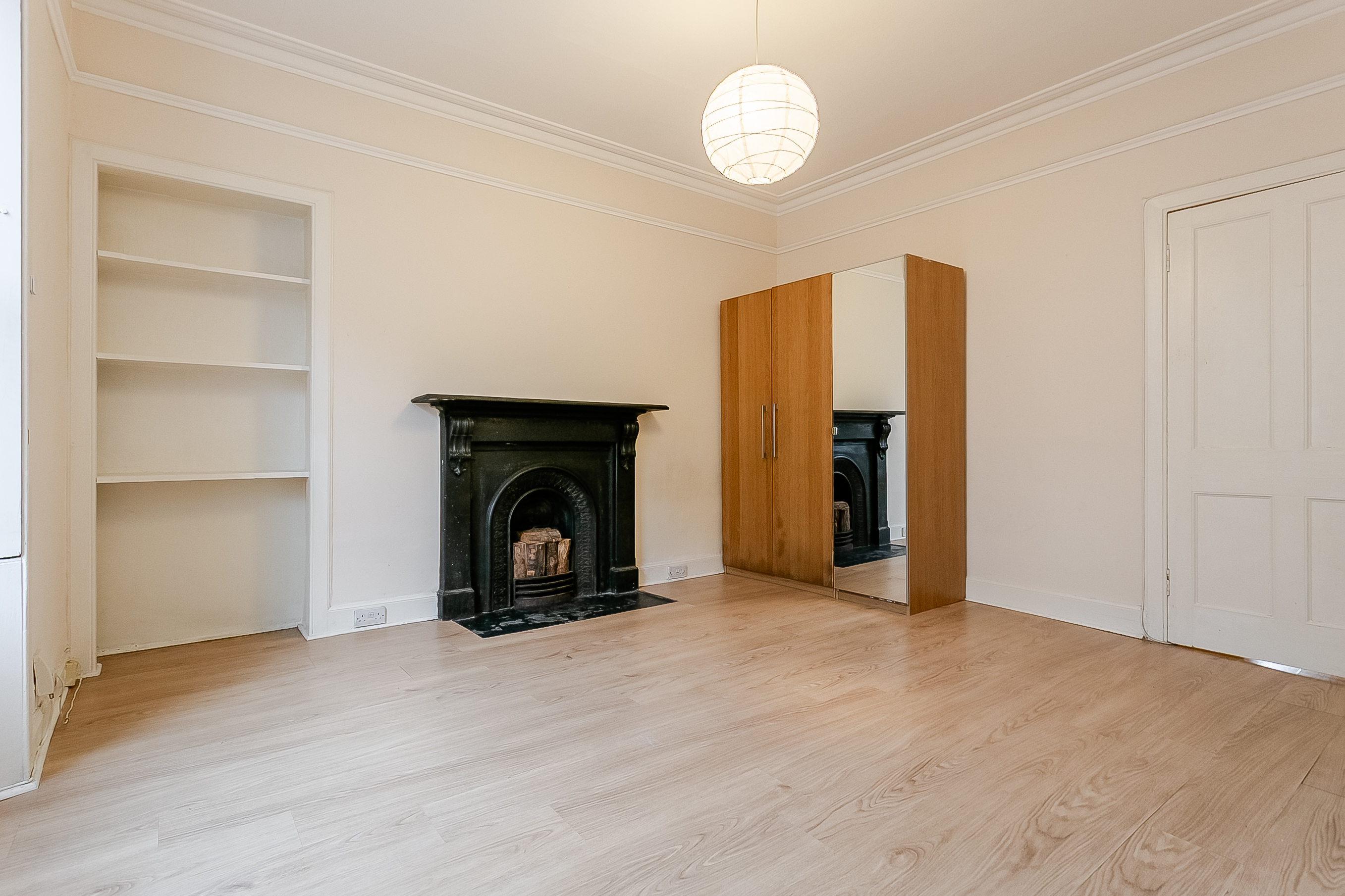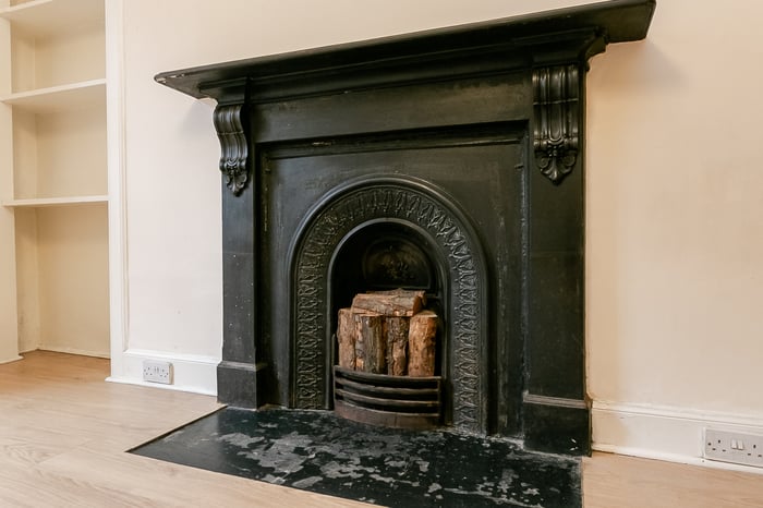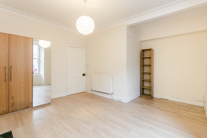 Located at the front of the property, the spacious bedroom enjoys a peaceful setting and is enhanced by wood-effect flooring, a charming fireplace and a large window that allows an abundance of natural light to fill the room. The generous proportions easily accommodate a double bed and additional bedroom furniture.