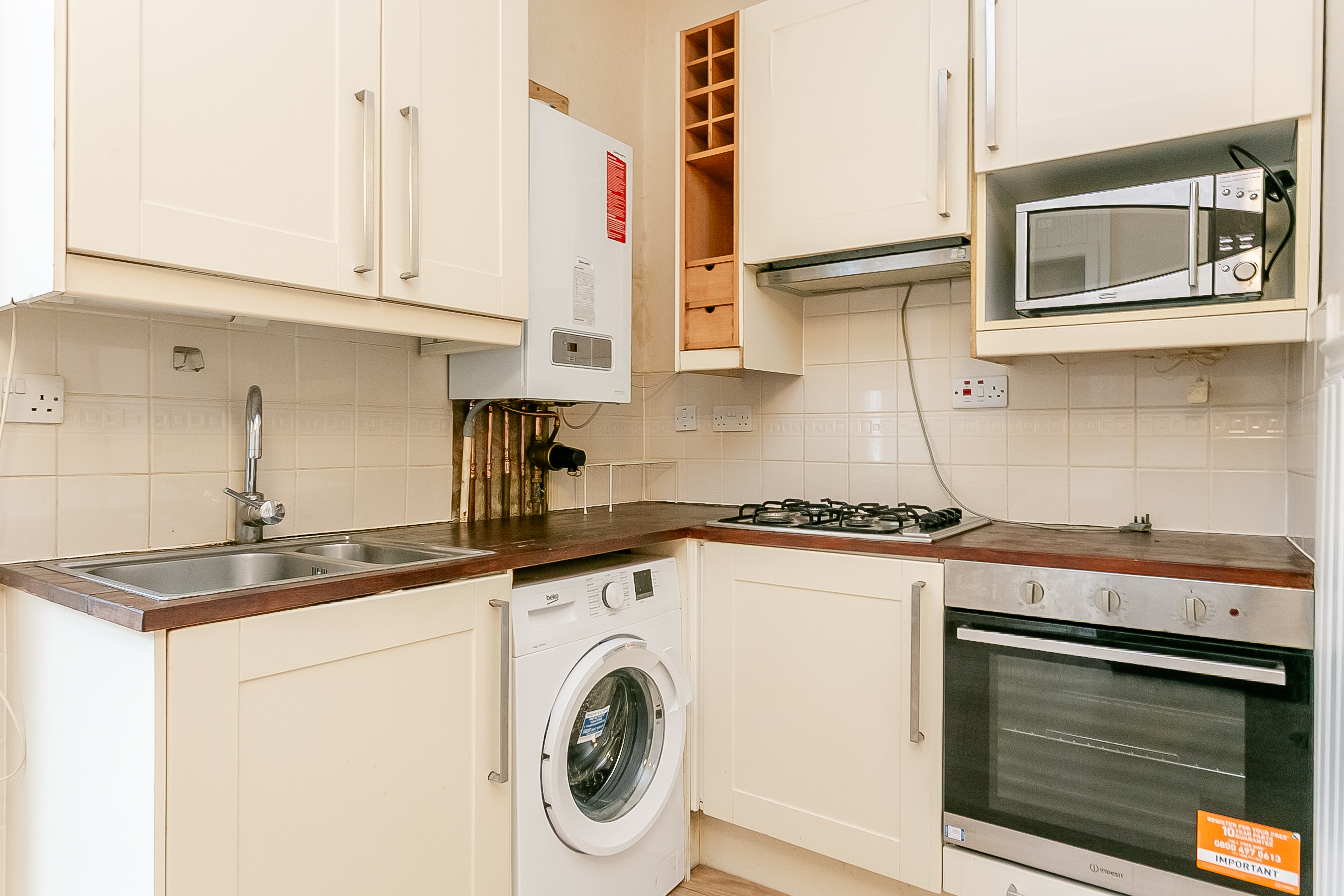 The kitchen is well equipped with hardwood worktops, a tiled splashback surround and a useful built-in storage cupboard. Further features include a sink with drainer and a range of appliances comprising a washing machine, microwave, integrated oven and gas hob with canopy extractor above.