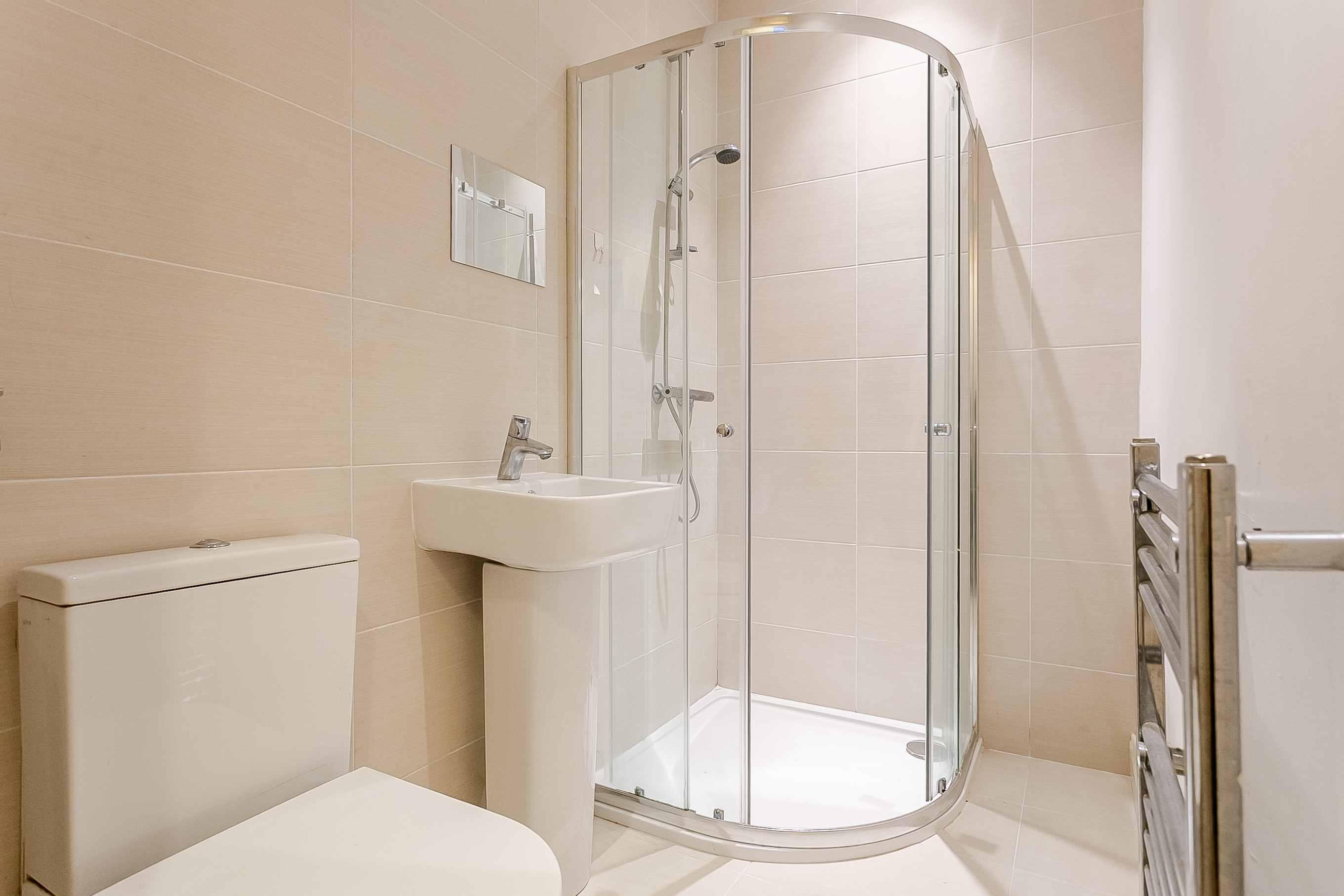 Completing the accommodation is a modern fitted shower room, benefiting from tiled flooring, a tiled splashback surround, contemporary spotlighting and a ladder-style radiator.