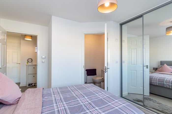 To the rear, the kitchen is fitted with modern units, wood effect worktops with matching upstands, a sink with drainer; and with appliances including an integrated oven, gas hob and washing machine, as well as a freestanding fridge/freezer. The master bedroom is set to the front with carpeted flooring, a central light fitting, a built-in wardrobe with mirrored sliding doors, and an en-suite shower room.