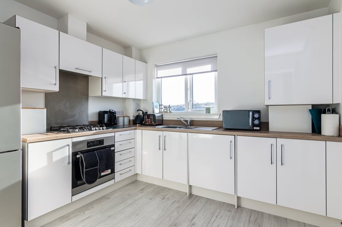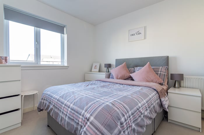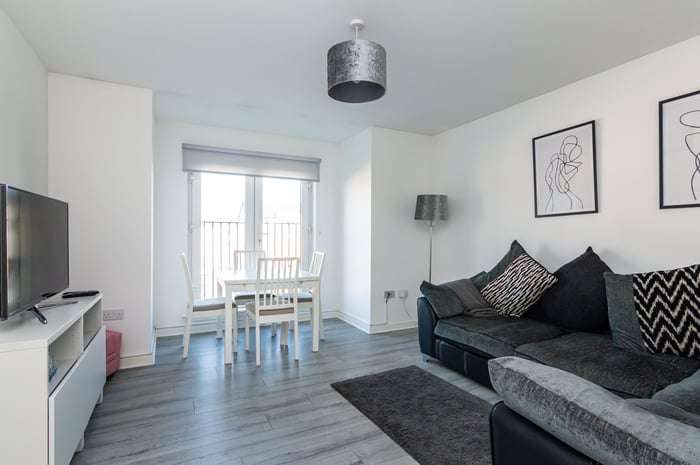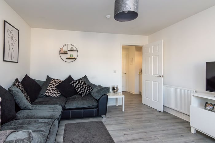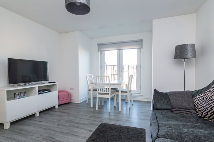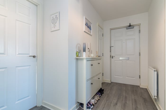 Immaculately presented, two-bedroom, dual-aspect flat on the second floor of a modern, factored apartment block, set in a residential development in the popular Wisp area, to the south-east of Edinburgh city centre. The entrance hall gives access throughout the property and features two storage cupboards and wood effect flooring extending through to the front-facing living room which offers ample space for dining and a Juliet balcony.