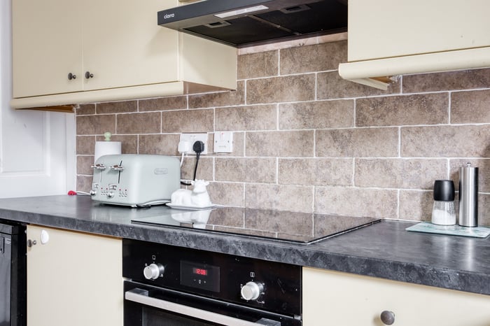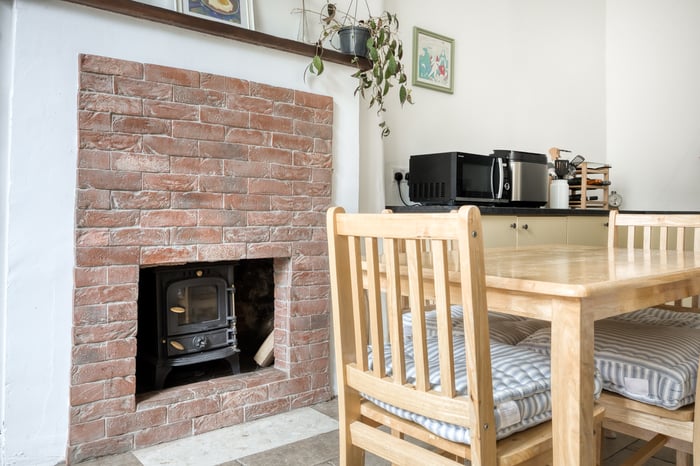 To the rear of the property sits the spacious living room, continuing the wood-effect flooring from the hallway and finished in light décor, complemented by a large window that floods the space with natural light. The kitchen is styled with tiled flooring, granite-effect worktops, and a tiled splashback, featuring a sink with drainer, an integrated oven with electric hob and canopy, plus space for two additional appliances as well as a woodburner.
