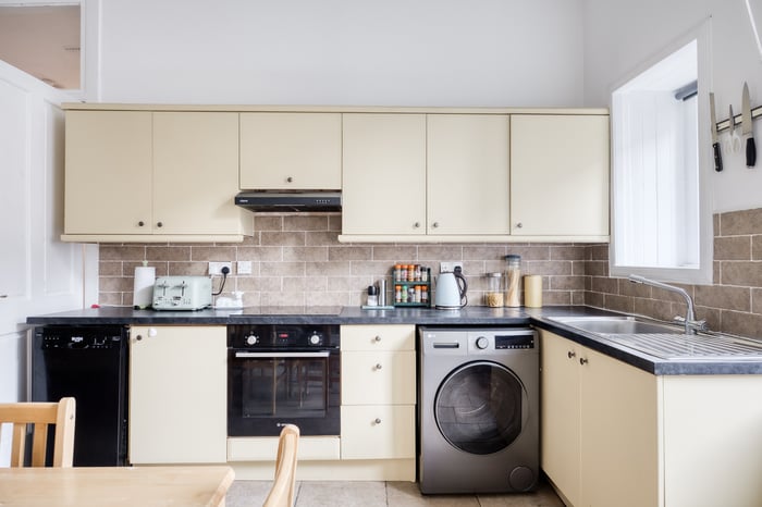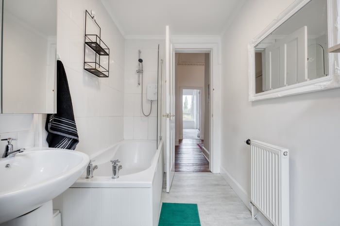Towards the front of the property, both bedrooms offer generous proportions with room for freestanding furniture; bedroom two is carpeted, while bedroom one benefits from a built-in cupboard ideal for storage. Completing the home is the family bathroom, fitted with a three-piece suite and a shower-over-bath.