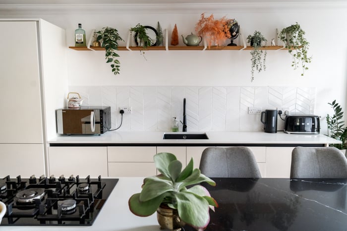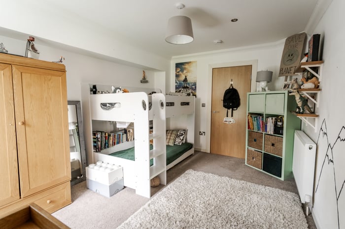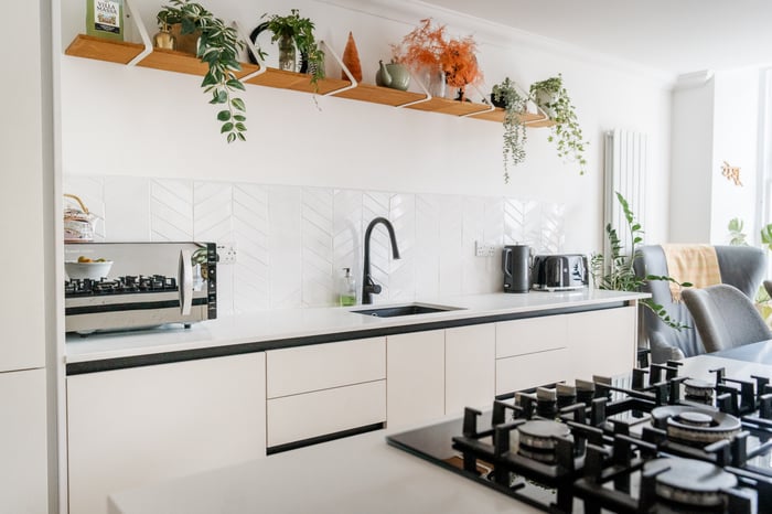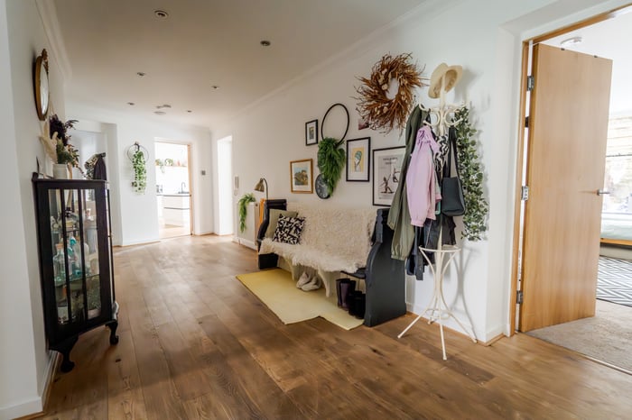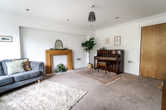 Set to the front, with light neutral decor, the living room features carpeted flooring, spotlighting, a central light fitting and a southerly-facing bay window enjoying plentiful natural light. Also set to the front, with dual access from both the living room and hall, is the generously sized and stylish kitchen with quality engineered hardwood flooring and a selection of contemporary lights.