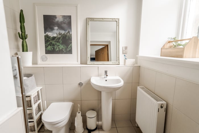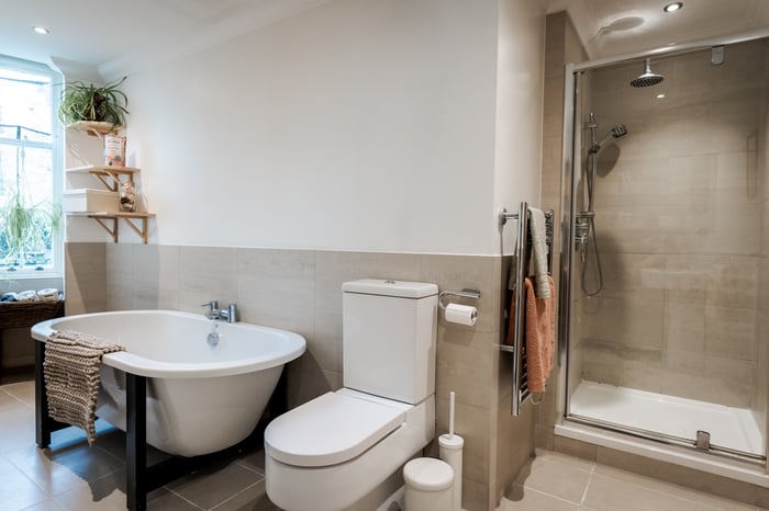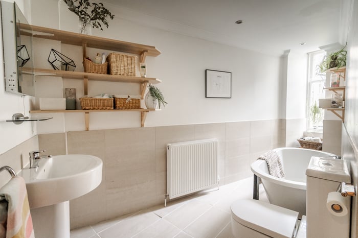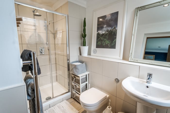 Completing the accommodation, a spacious bathroom is fitted with a stylish four-piece suite including a standalone bathtub, a large cubicle with a mains mixer shower including a rainfall showerhead, as well as a standard hose, tiled splash walls and flooring, and a ladder-style radiator.