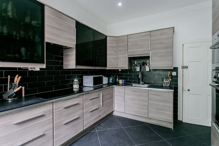 To the rear of the property is the kitchen, finished with tiled flooring, fitted countertops, a tiled splashback, a sink and drainer, and integrated appliances including an oven, electric hob with canopy, induction hob, dishwasher, and fridge/freezer. There are three bedrooms in total—two doubles and one single—all completed with wood-effect flooring and light décor, with bedrooms one and two benefitting from mirrored built-in wardrobes.