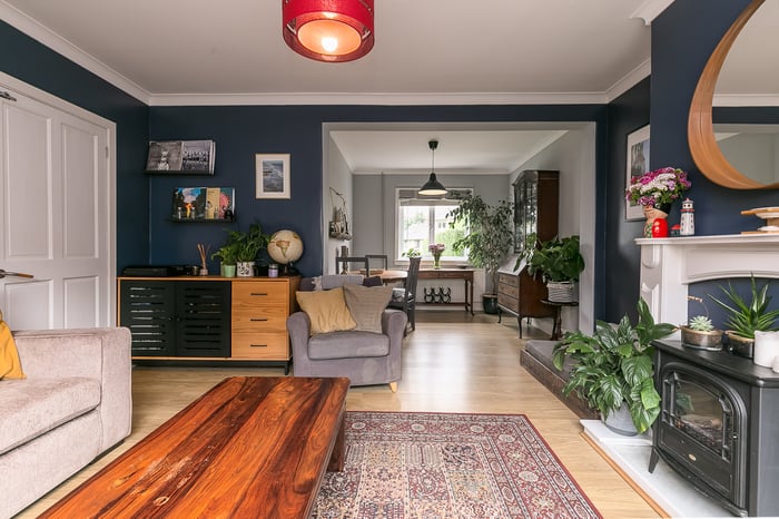 Set to the front, an open-plan living and dining room is tastefully finished with modern, wood-effect flooring, a traditional fireplace and smooth cornicing. The spacious, versatile floor plan allows great flexibility for a variety of freestanding furniture and storage.