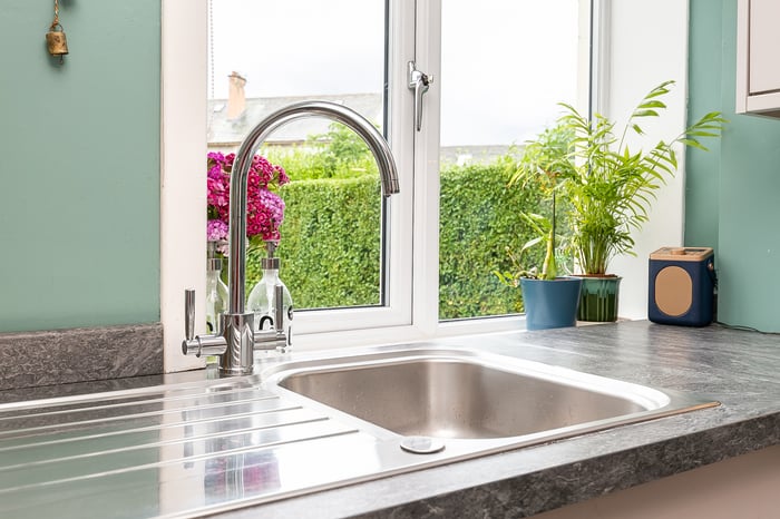 A rear-facing kitchen provides garden access, via a hall, with a cupboard. The kitchen is fitted with contemporary units and worktops, an integrated oven, a ceramic hob, a canopy and a fridge/freezer, whilst plumbing and space are available for a freestanding washing machine.
