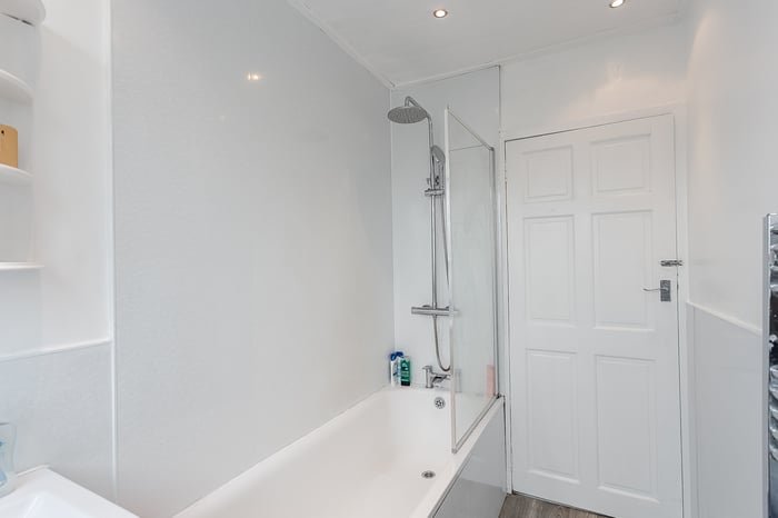 Completing the accommodation, the modern three-piece bathroom is finished to a high standard with wood-effect flooring, a stone-effect splashback surround, contemporary spotlighting, a rainfall shower over the bath, and a ladder-style radiator.