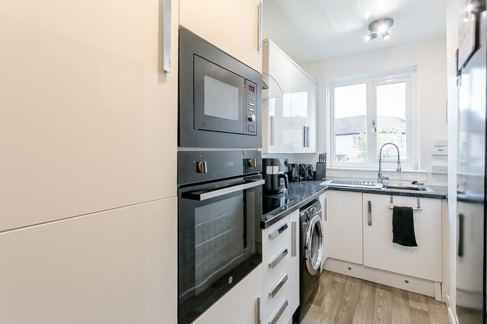 The fitted kitchen is well-designed with stone-effect worktops, wood-effect flooring, and a stainless-steel sink with a drainer and mixer tap. Integrated appliances include an oven, microwave, fridge/freezer, washing machine, and an electric hob with canopy above.
