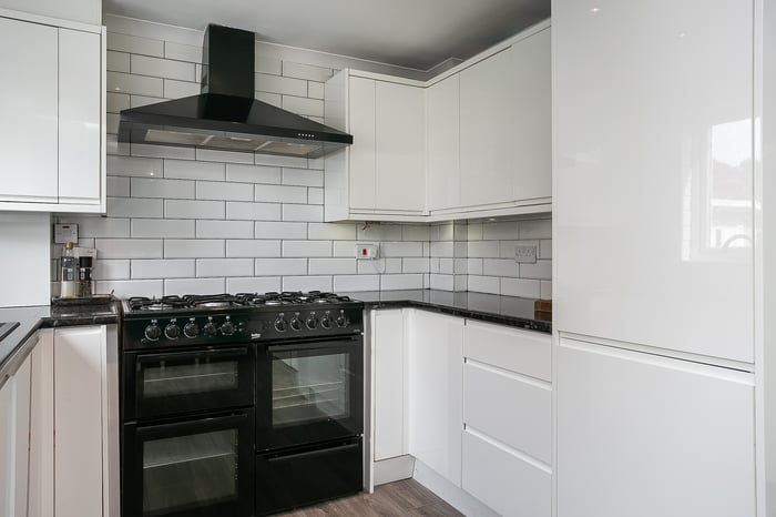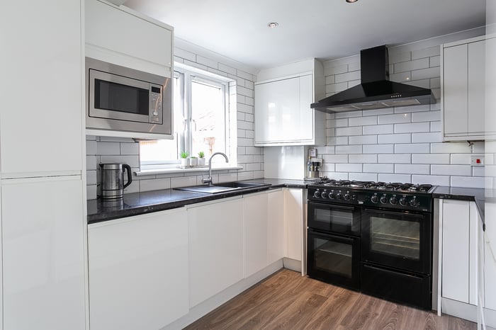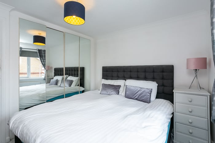 The stylish kitchen is fitted with modern units and worktops, a tiled surround and a sink with drainer; with appliances including an integrated fridge/freezer, washing machine, dishwasher and microwave. On the upper floor, the master bedroom is set to the rear, tastefully finished in light decor, carpeted flooring, a built-in wardrobe with mirror sliding doors, and a modern en-suite shower room; whilst two further carpeted bedrooms are set to the front, similarly well-sized, with bedroom two featuring a built-in cupboard.