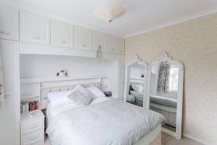 Carpeted stairs lead to the upper hall, where two double bedrooms are set to each aspect, with the main bedroom benefiting from a built-in wardrobe with mirror doors and a further built-in storage cupboard. Completing the accommodation, the bathroom is fitted with a three-piece suite including a shower over the bath and tiled splash walls.