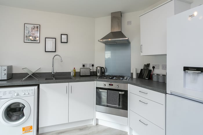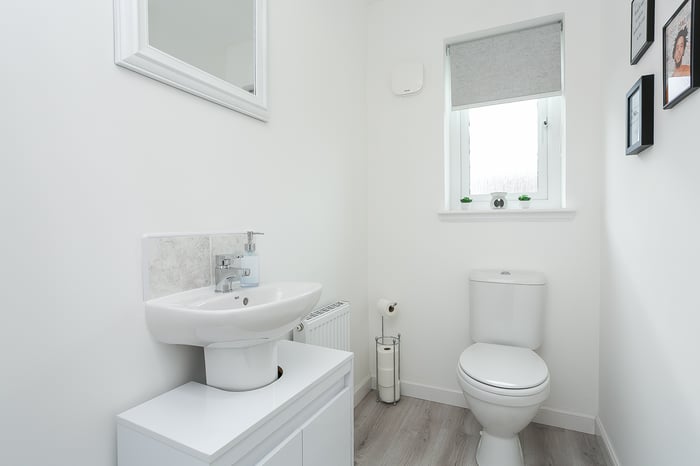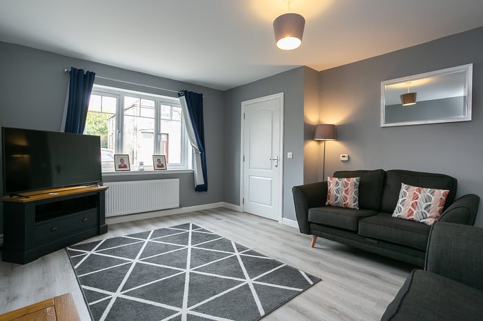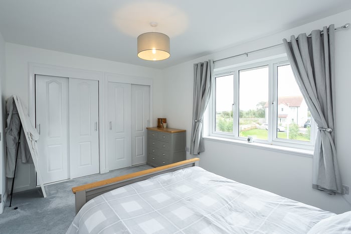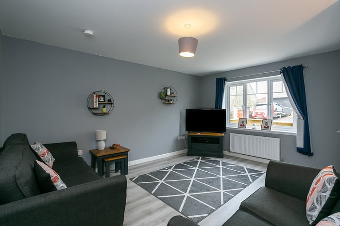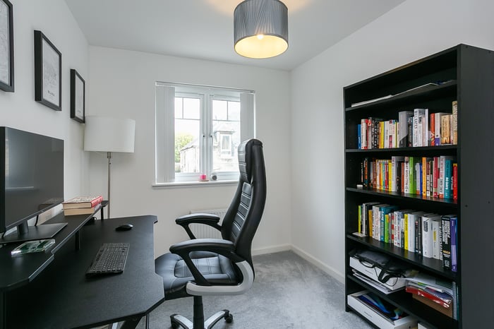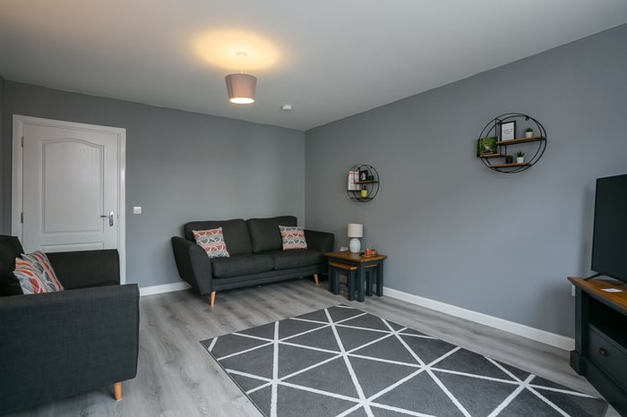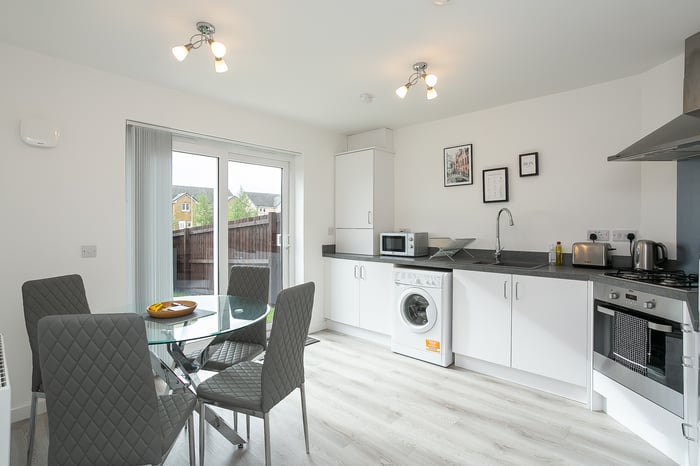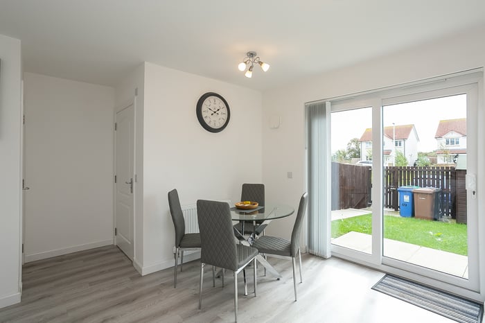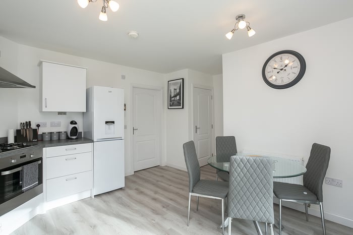 Light and immaculately presented, three-bedroom, semi-detached home with gardens and residential parking. Set in a modern development, northwest of Dunfermline centre, Fife. A welcoming entrance hall affords access to the carpeted stairs leading to the upper hall; and the front-facing living room, finished with tasteful decor and offering a spacious room for lounge furniture.
