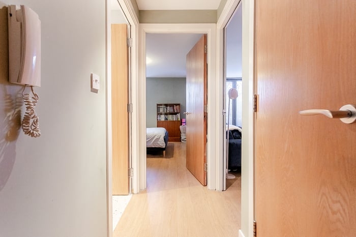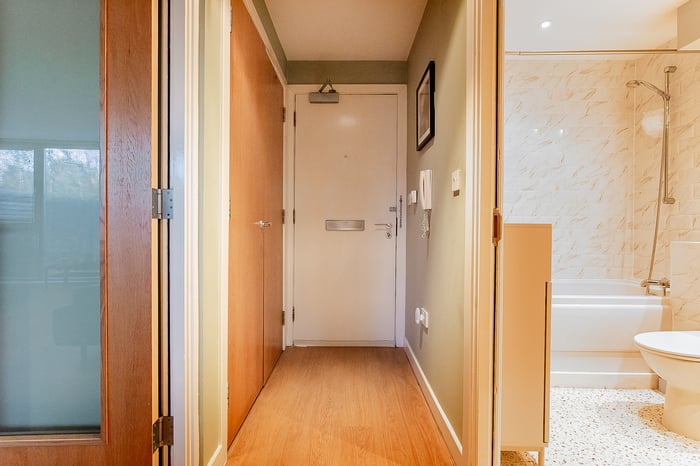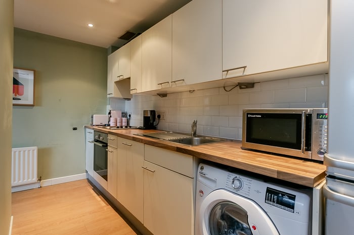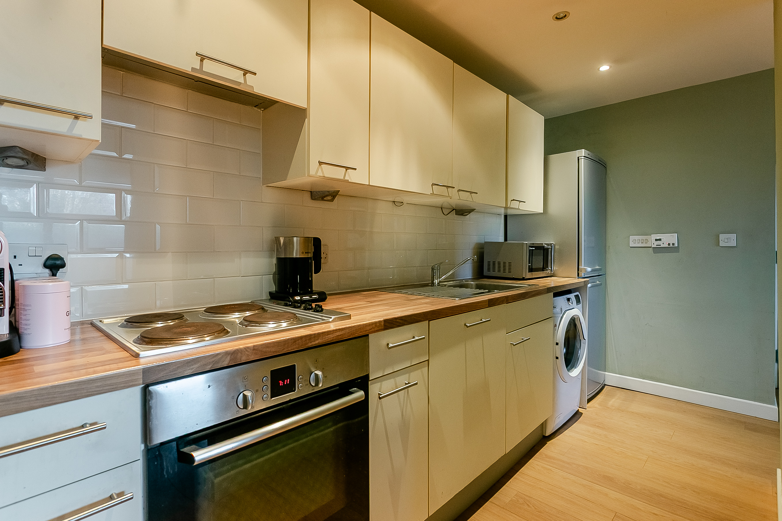 The modern kitchen features wood-effect worktops, a stylish splashback, an integrated oven with electric hob and canopy above, as well as a washing machine, dishwasher, and fridge/freezer. The living area further benefits from additional access to the bedroom, continuing the contemporary flooring, along with a double wardrobe providing excellent storage.