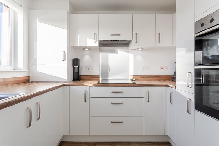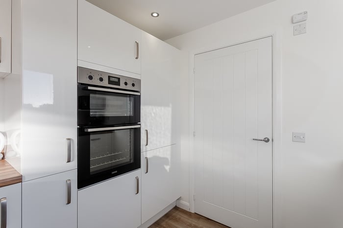 Large patio doors open directly onto the rear garden, allowing natural light to fill the room and offering an easy connection between indoor and outdoor living. The modern, fully integrated kitchen is thoughtfully designed with stylish wood-effect worktops, sleek units and quality fittings throughout.