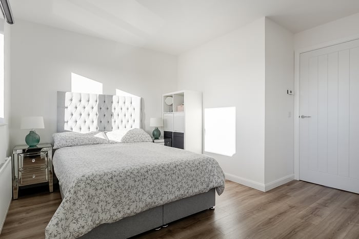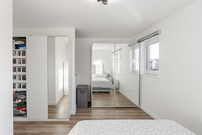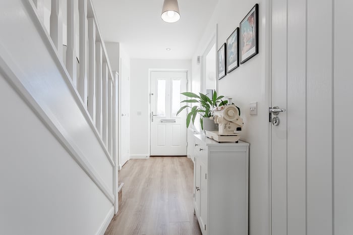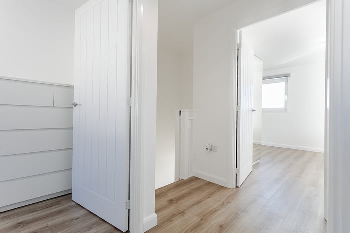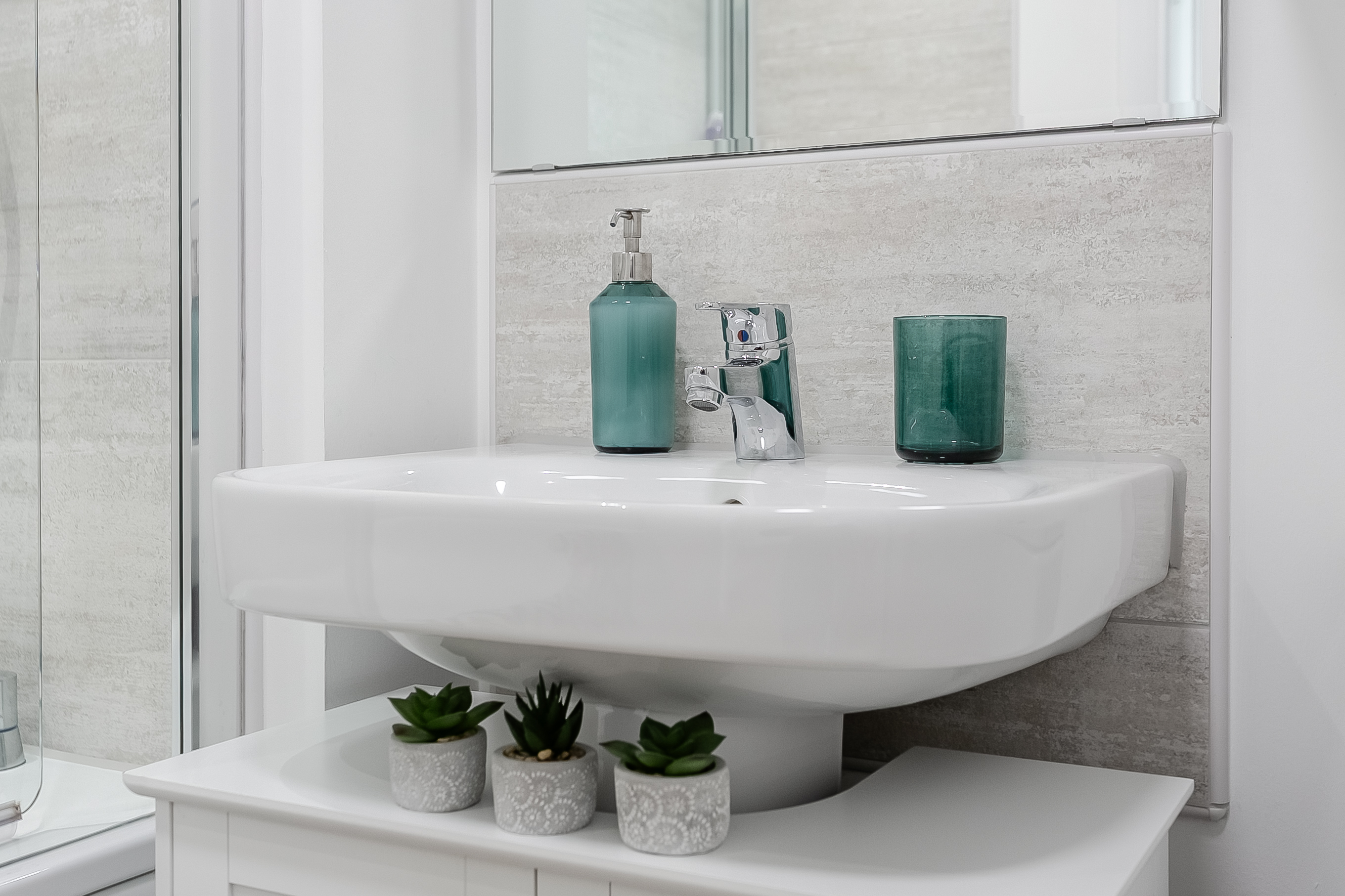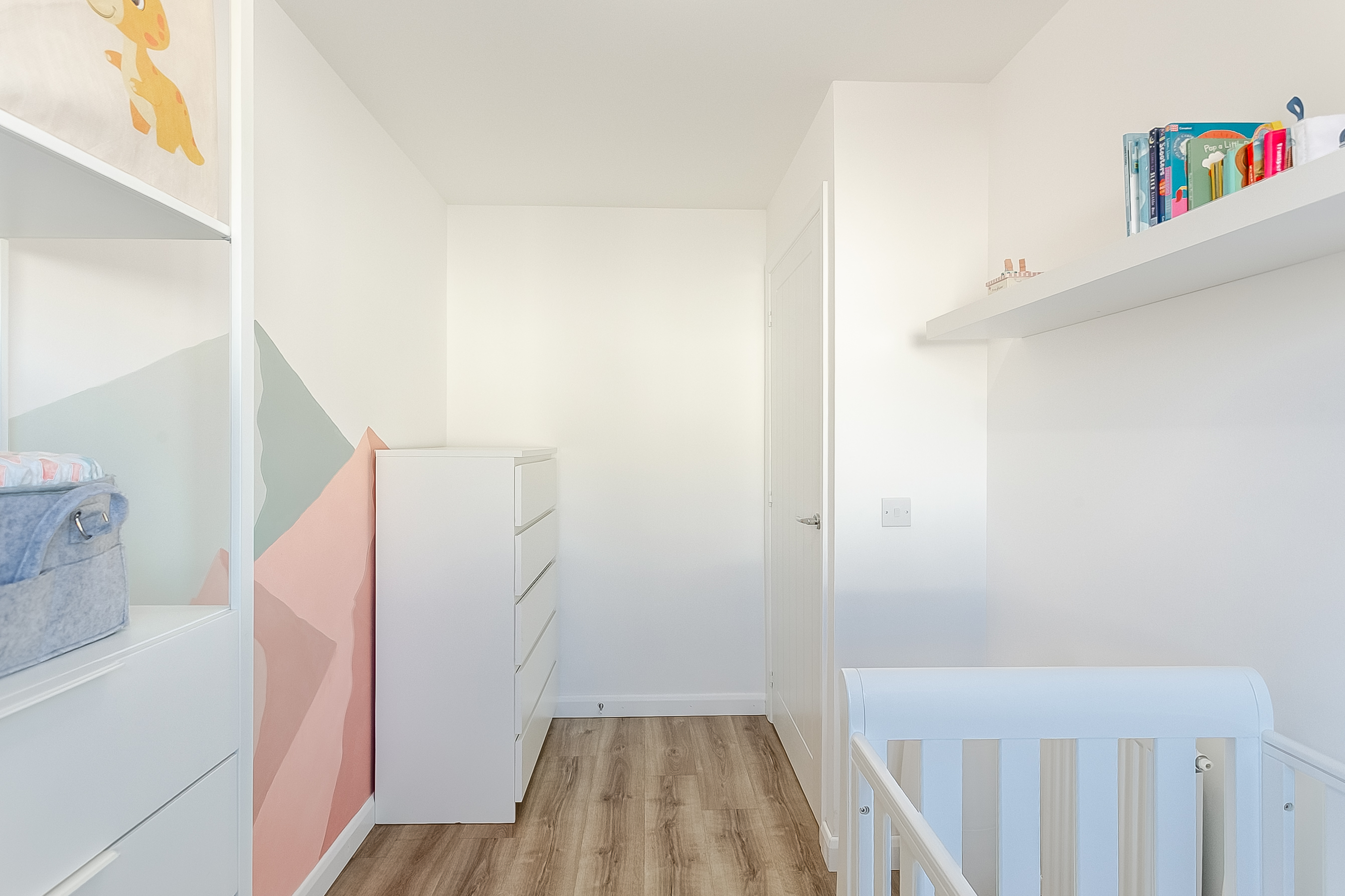 The two additional bedrooms also benefit from good natural light and provide flexible space suitable for children, guests, or a home office. The modern family bathroom completes the first floor and features a stylish tiled splashback surround, central light fitting and a shower over the bath.