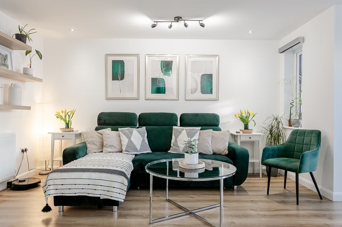 This room enjoys wood-effect flooring, a wall-mounted TV point, and a useful built-in storage cupboard. Central ceiling lighting is complemented by subtle spotlighting, creating a warm and inviting atmosphere.