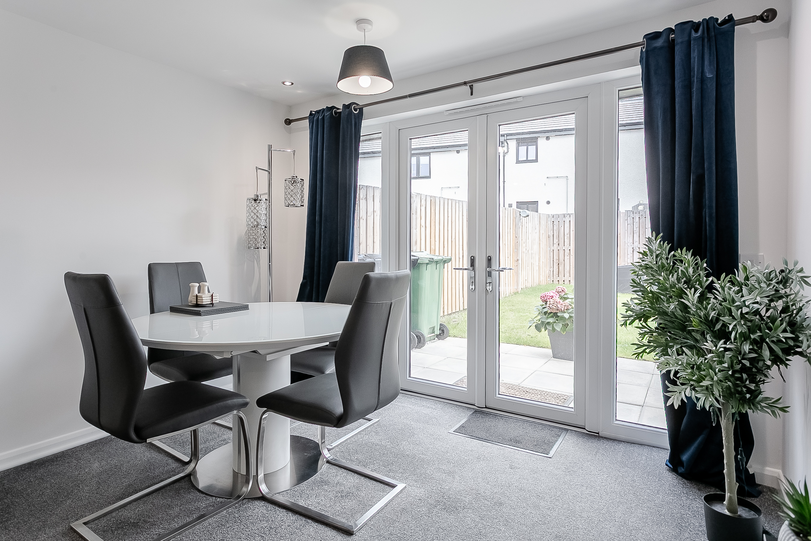 Immaculately presented, three-bedroom, end-terrace house, with private gardens. Set in a modern residential development in The Wisp area, south of Edinburgh city centre. The entrance leads into the property with the living room positioned at the rear, featuring carpeted flooring, light décor, and direct access to the private garden, making it an ideal space for entertaining, along with a built-in cupboard for storage.