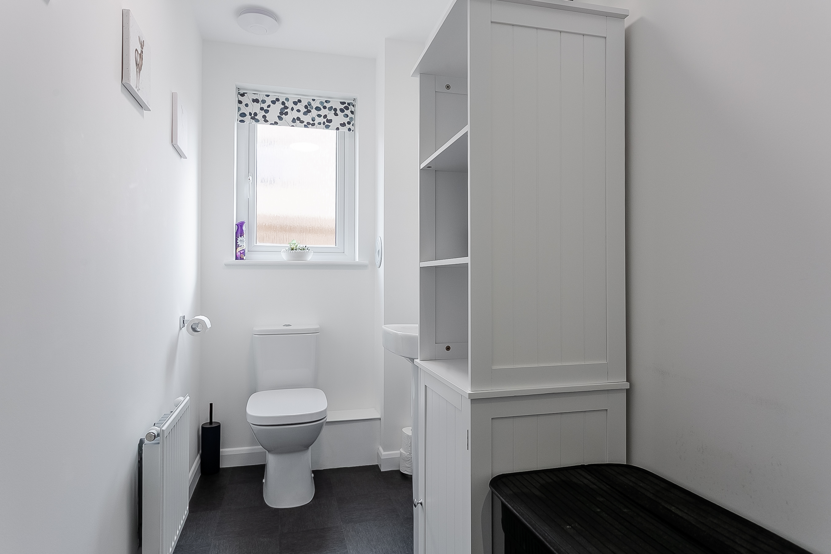 Towards the front, the kitchen is finished with contemporary flooring, matching countertops and upstands, a sink with drainer, an integrated double oven, a gas hob with canopy, a washing machine, a dishwasher, and a fridge freezer. Upstairs, the carpeted landing provides access to three bedrooms, each also carpeted and bedroom one benefits from built-in cupboards, while offering ample space for free-standing furniture.