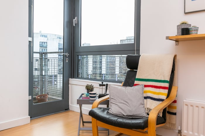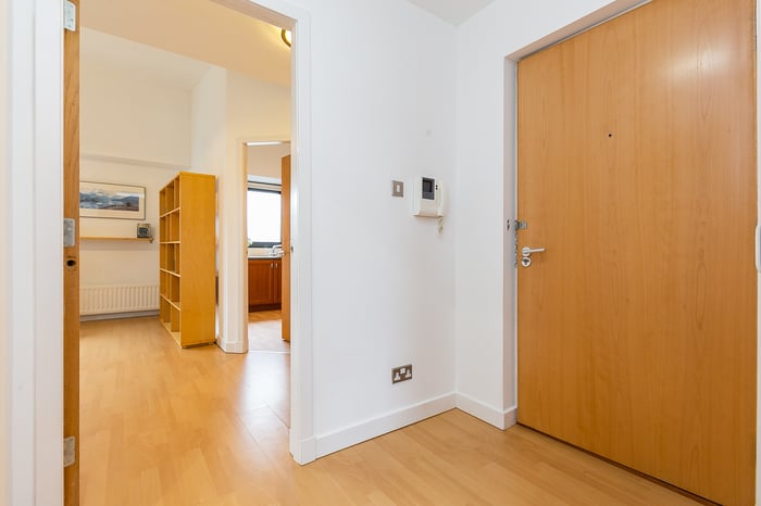 *NEW FIXED PRICE- £20,000 BELOW VALUE* Light and immaculately presented, one-bedroom, corner-aspect, fourth-floor (top) flat of a modern residential development. Located in Leith’s fashionable Shore district, lying to the north-east of Edinburgh city centre. The hall has space for outerwear, and features a built-in cupboard and a secured entry system.