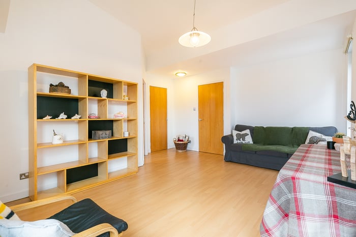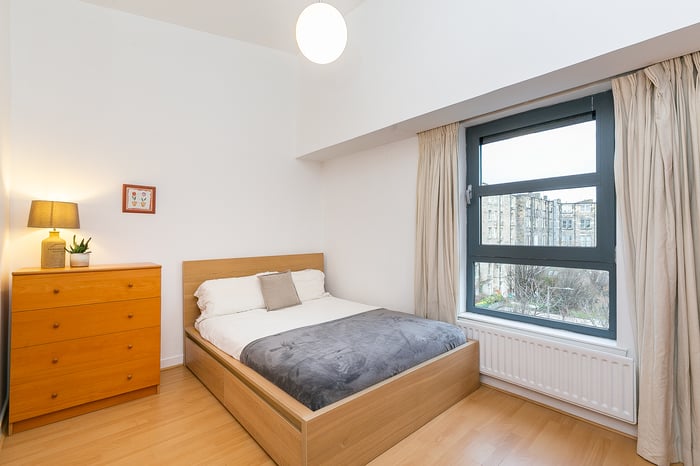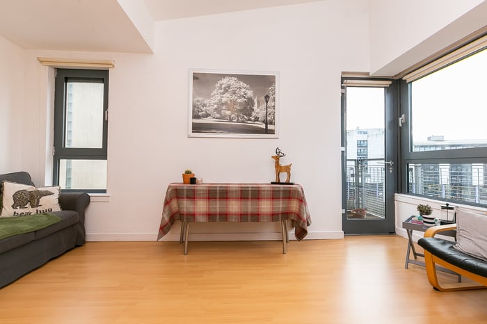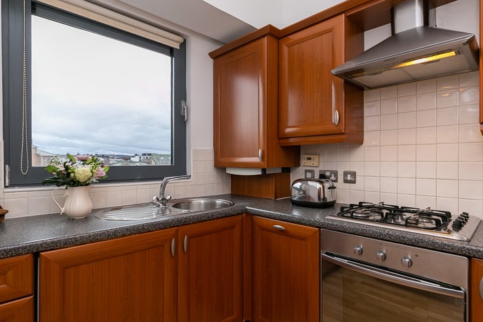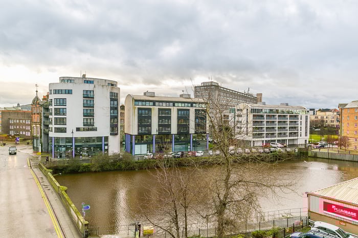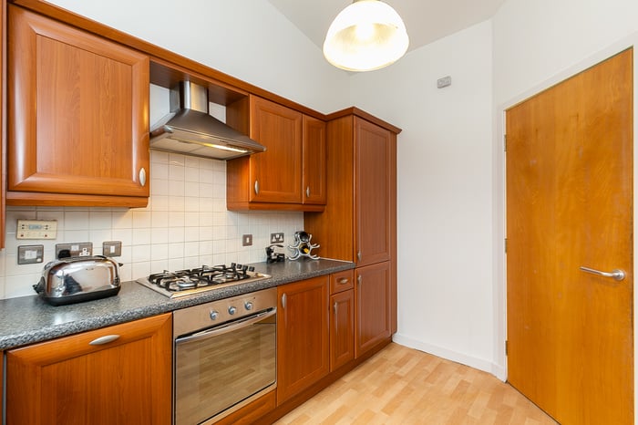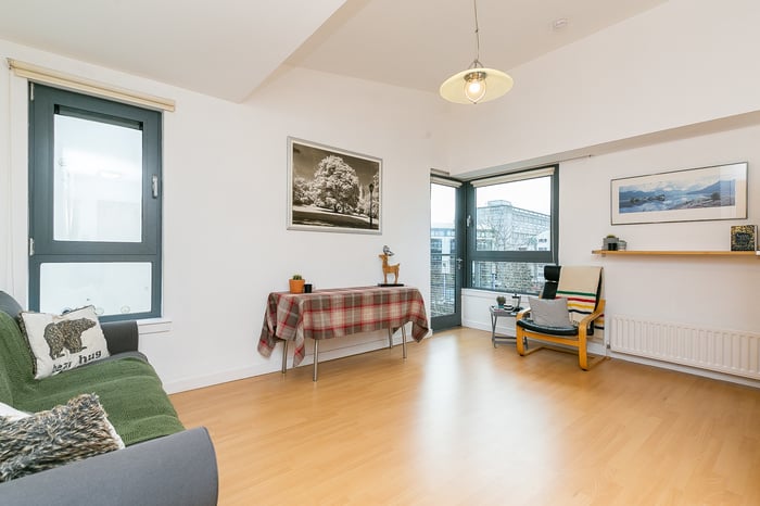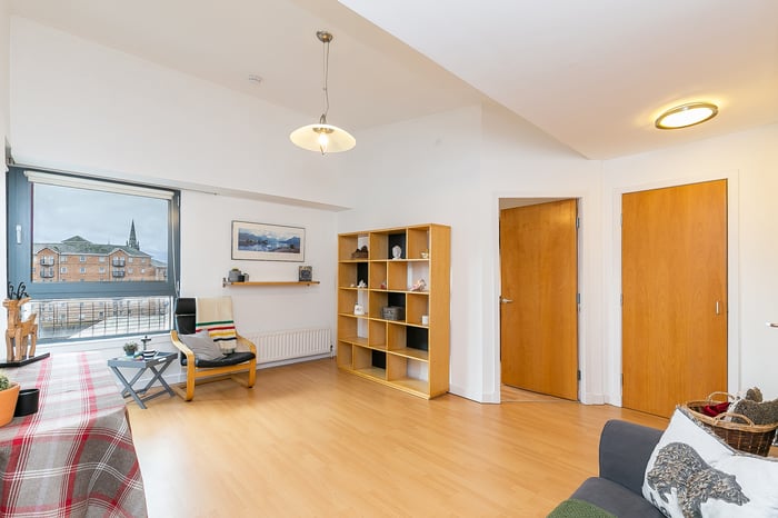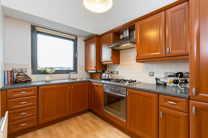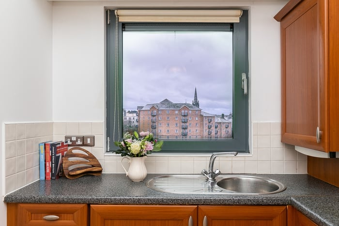 Wood-effect flooring continues from the hall into a public room, with TV and phone points, a pendant light fitting and a southerly view over the Water of Leith. Set off the lounge, a modern kitchen features stone-effect worktops, a sink with a drainer, a tiled surround, an integrated washing machine, a dishwasher, a fridge/freezer, an oven, a gas hob and a canopy.