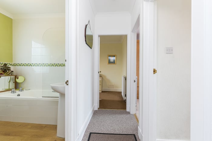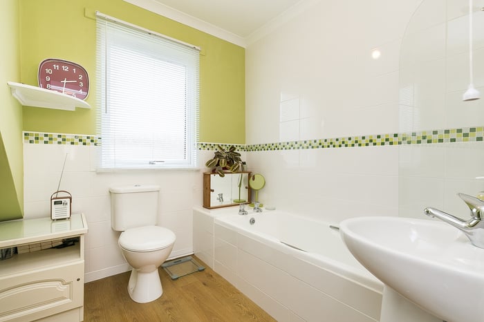 Completing the accommodation, the generously proportioned bathroom is at the back, containing a three-piece bathroom suite, with a mains shower over the bath, tiled splash walls, wood-effect flooring and additional storage space.
