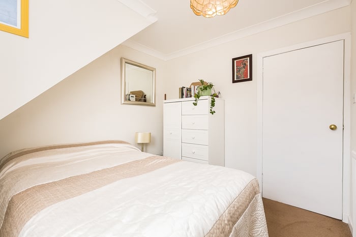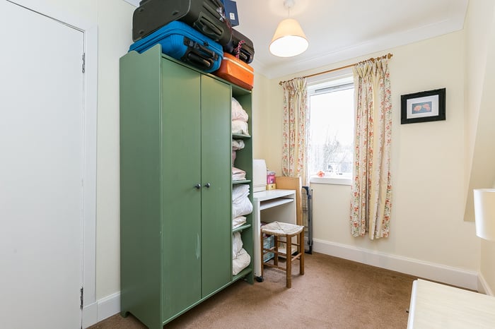 Off the hall, the utility area has a rear-facing window and contains the boiler and washing machine. On the upper floor, the two double bedrooms are front-facing and include carpeted flooring and plain coving; the single bedroom is set to the rear, similarly finished.