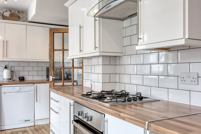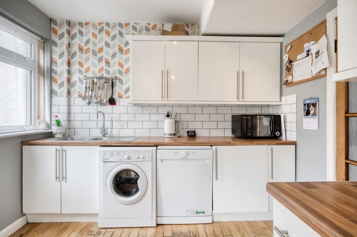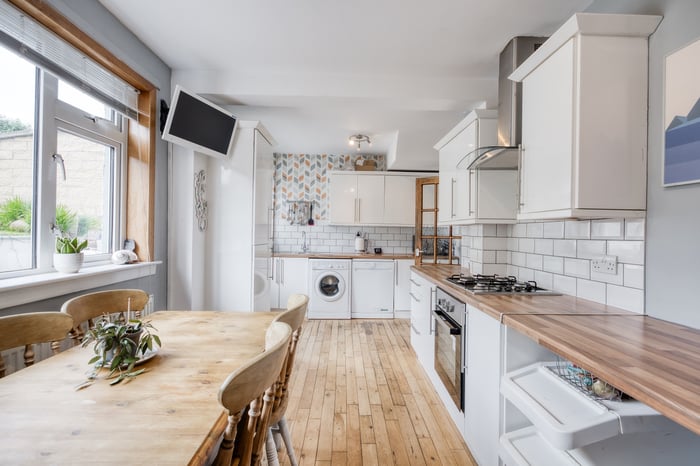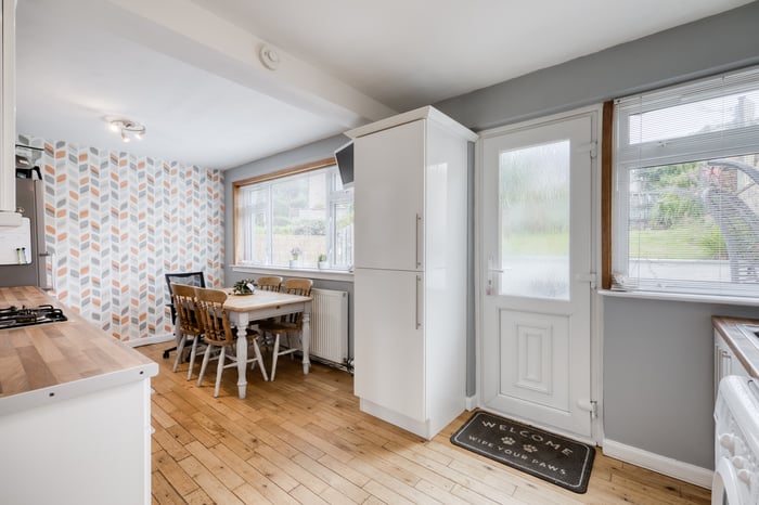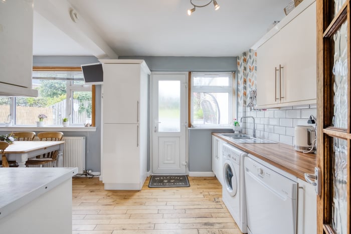 This space also provides direct access to the rear garden, ideal for entertaining or relaxing outdoors. Integrated appliances include a built-in oven, freezer, and a gas hob with an overhead canopy extractor.