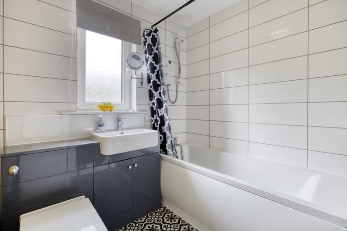 Completing the home is a sleek and modern bathroom, fitted with a three-piece suite, tiled splashback, shower-over-bath setup, and a central ceiling light.