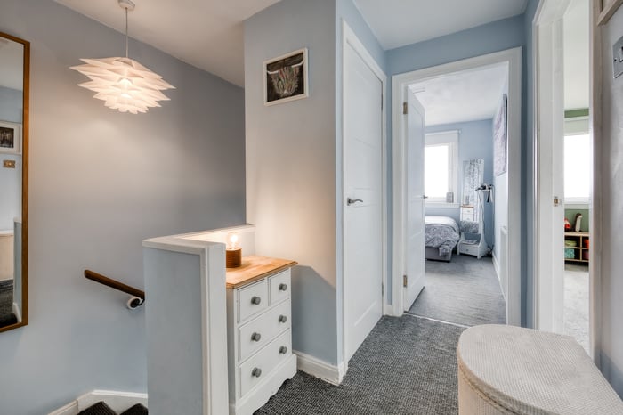 Upstairs, you ll find three comfortable double bedrooms, all fully carpeted for warmth and comfort. Bedrooms one and two benefit from multiple built-in storage cupboards, providing excellent wardrobe and organisational space.