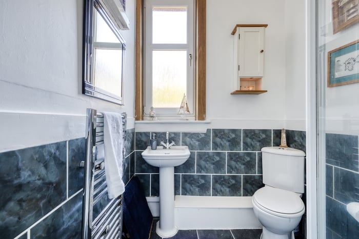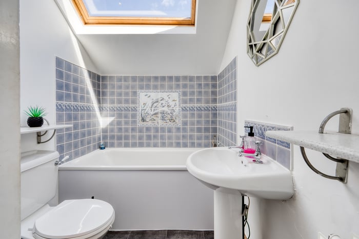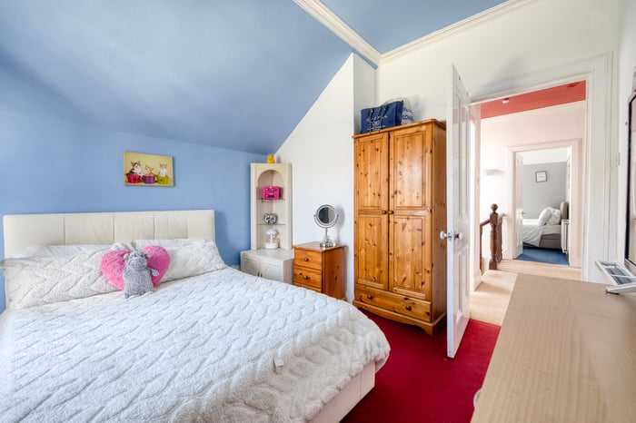The additional bedrooms are all tastefully finished, with bedroom three benefiting from built-in wardrobes and drawers. A family bathroom completes the upper level, offering a three-piece suite, tiled splash walls, and a Velux-style window.