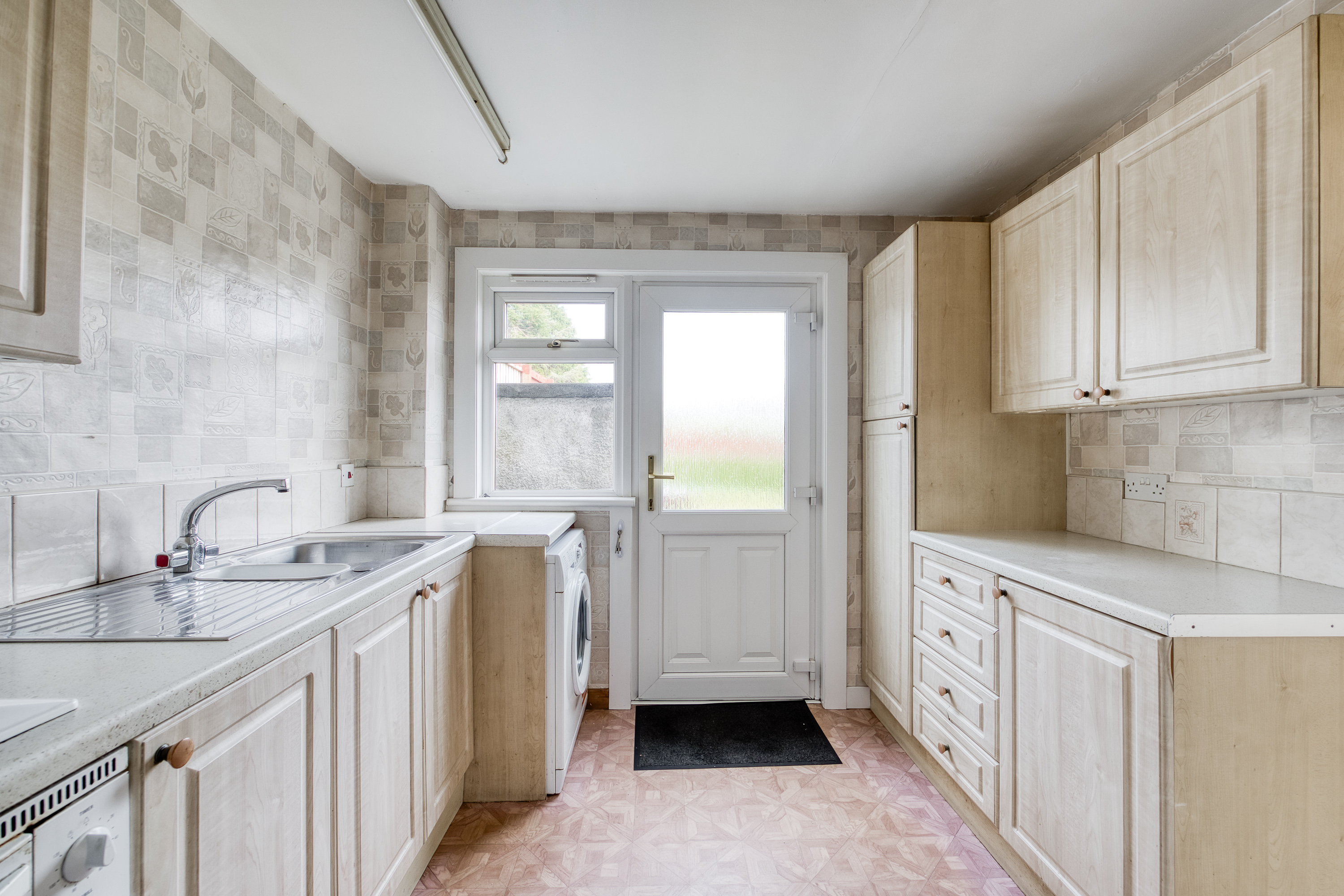 To the rear of the property, the well-presented kitchen features a practical tiled-effect floor, fitted countertops, a tiled splashback, and a sink with a drainer, along with ample space for additional appliances. From here, you can step directly out into your own private garden—perfect for relaxing or entertaining.