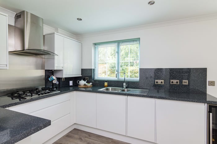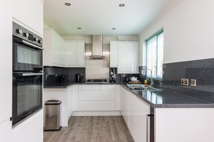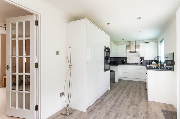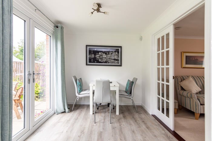 The bright and spacious living room is set to the front, with carpeted flooring, pendant lighting and a box bay window affording plentiful natural light. The stylish dining kitchen was fitted eighteen months ago with modern, high-gloss white units, stone worktops with matching splashbacks, a stainless steel sink, space for freestanding dining furniture and French doors opening to the rear garden.