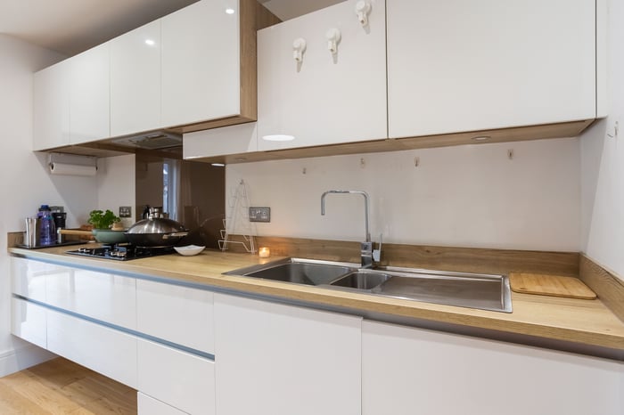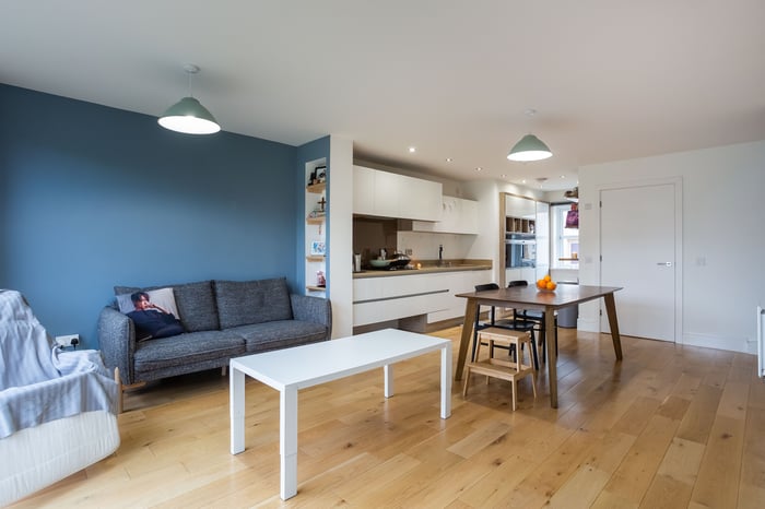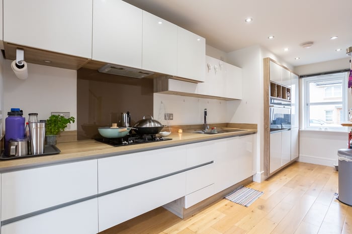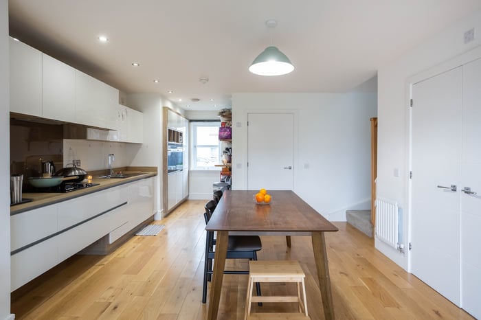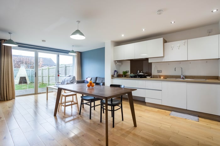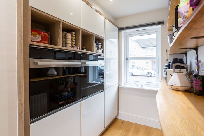 Features include quality flooring throughout, with light pendant lights for the lounge and dining area, spotlights for the kitchen, and a utility cupboard housing the washing machine. The stylish kitchen is fitted with modern units, wood effect worktops with matching upstands and a sink with a drainer, with integrated appliances including a double oven, a gas hob, a fridge/freezer and a dishwasher.