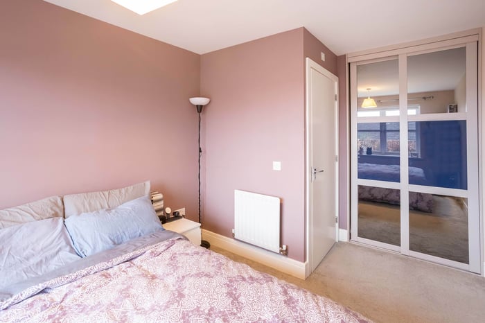 On the upper floor, set to the rear, overlooking the garden, the master bedroom features carpeted flooring, a central light fitting, a built-in wardrobe and a modern en-suite shower room with a rainfall showerhead. Two further carpeted bedrooms are set to opposite aspects, with bedroom two featuring a built-in wardrobe with mirror sliding doors.