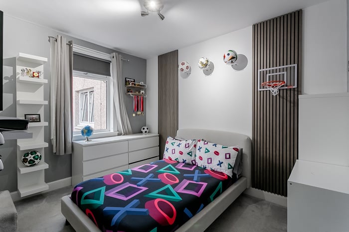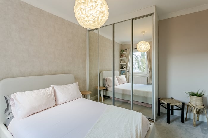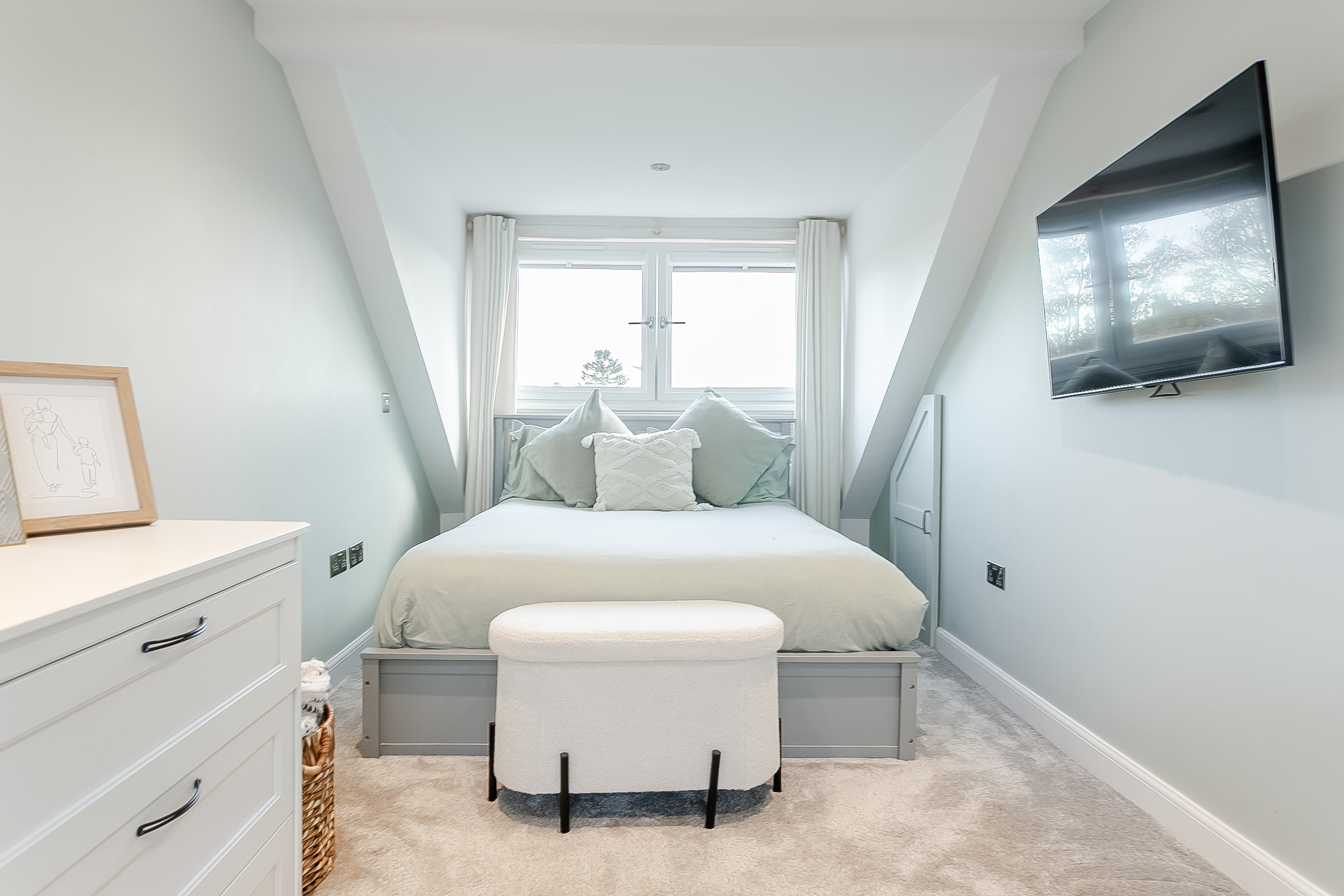 On the first floor, three carpeted bedrooms provide comfortable accommodation, each featuring a wall-mounted TV point. Bedroom four benefits from a built-in wardrobe with mirrored sliding doors, offering convenient storage and a sense of added space.