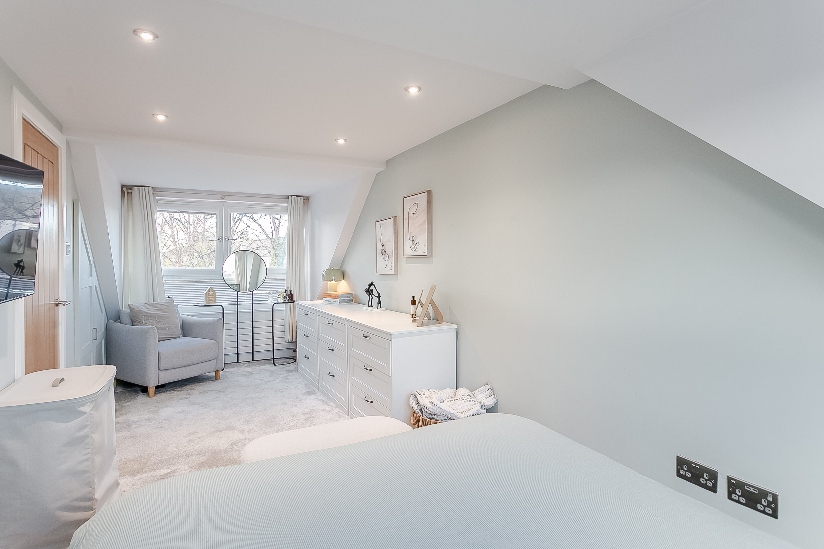 All bedrooms are tastefully decorated, creating a restful environment for family members or guests, with good storage provision across the floor. The second floor hosts the principal bedroom suite, featuring plush carpeting, recessed spotlighting, and two built-in storage cupboards.