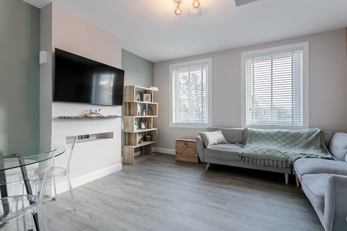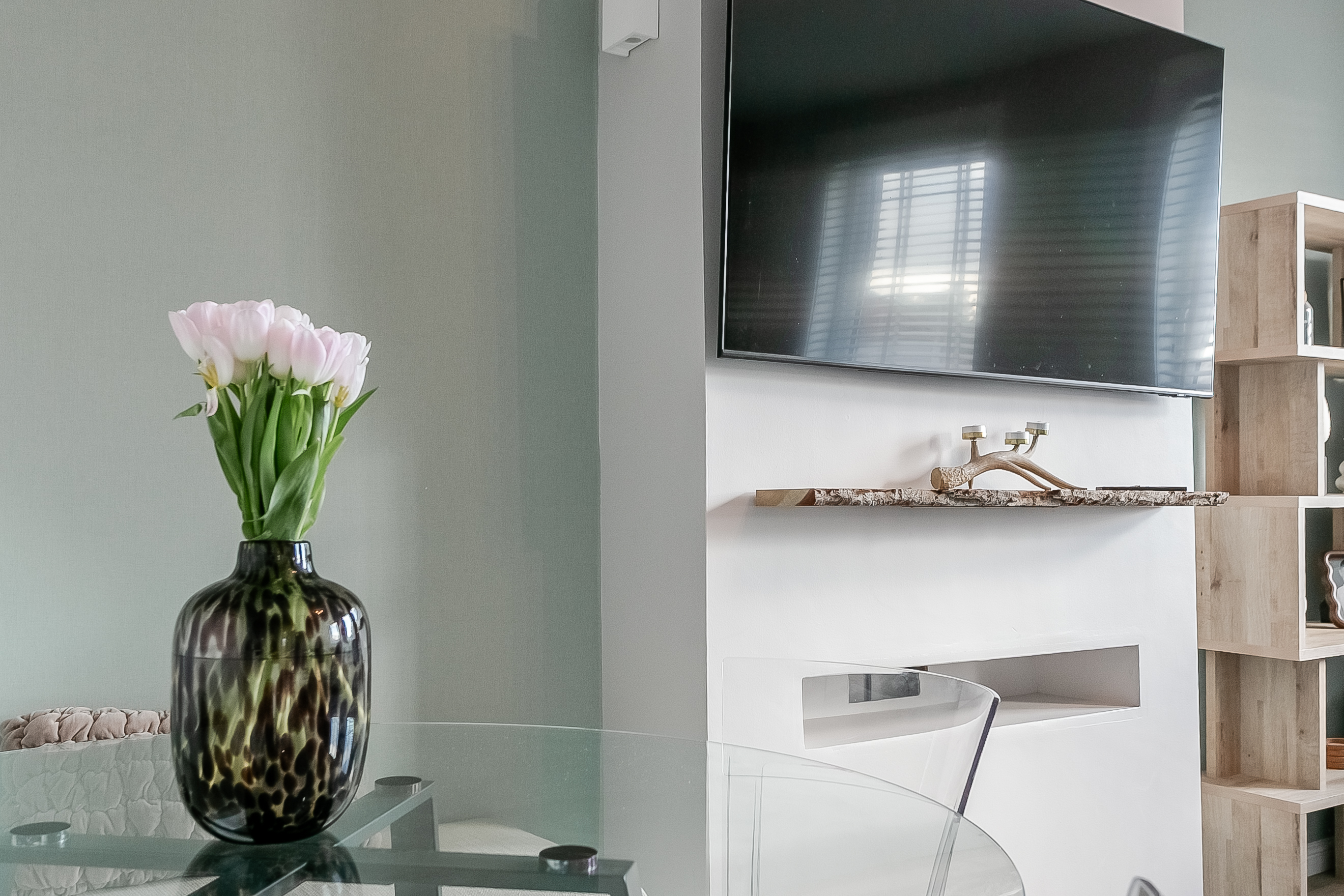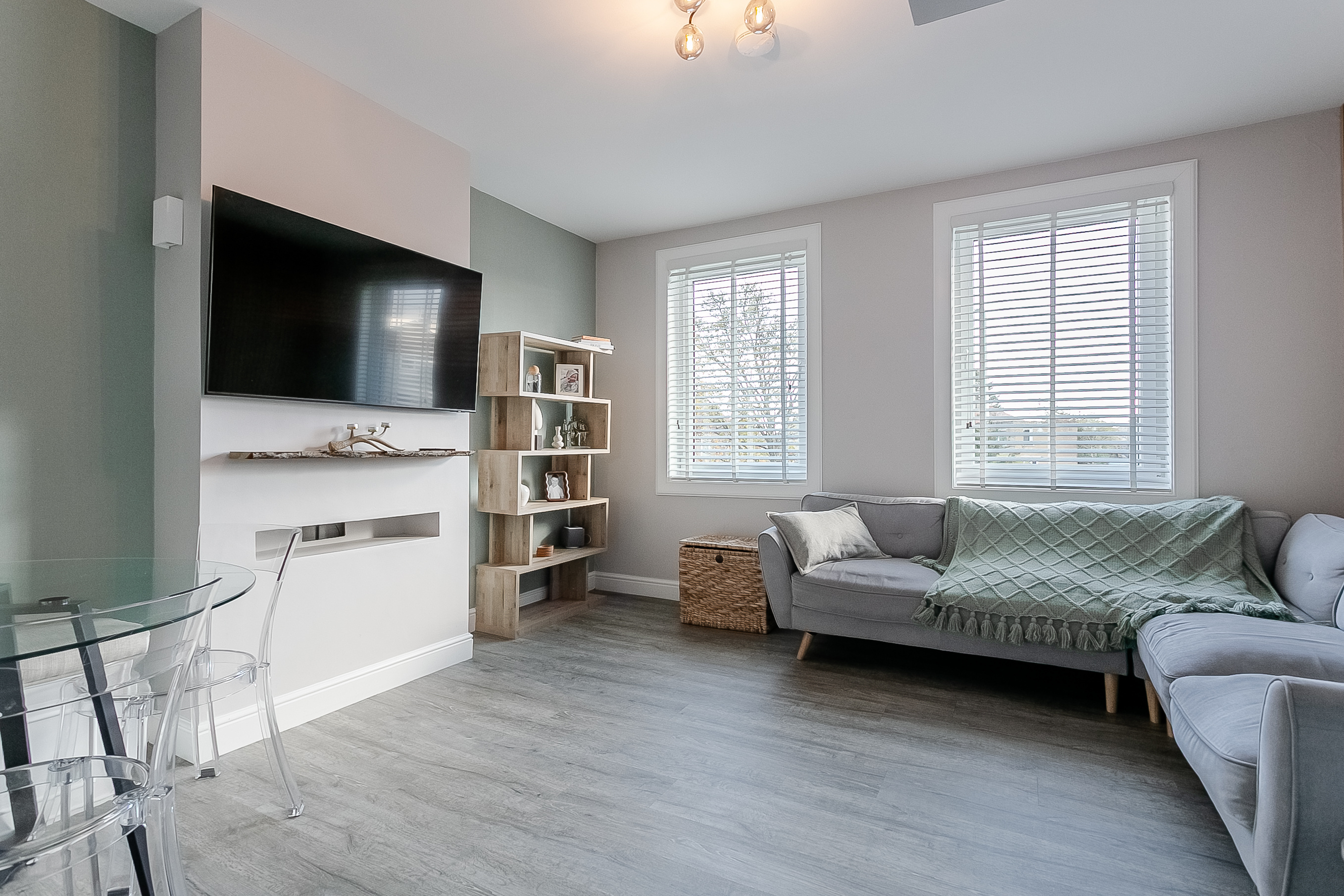 Its tasteful neutral décor creates a calm and contemporary atmosphere, while the wall-mounted TV point and built-in storage cupboard add both practicality and style. The room offers ample space for both a comfortable seating area and a dedicated dining space, making it perfect for relaxing or entertaining guests.