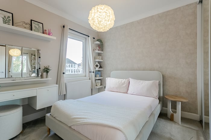 The room’s generous proportions and subtle décor make it an inviting private retreat with excellent storage options. Adjacent to this is bedroom two, also well-proportioned and ideal as a guest room, nursery, or home office.