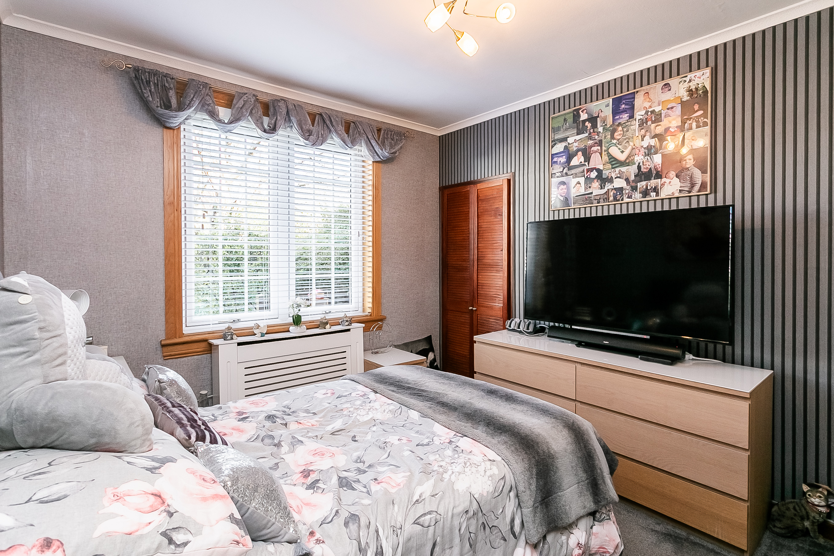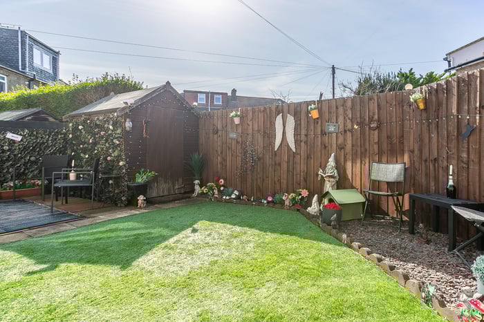 • Highly maintained gardens include a paved driveway and generous lawn to the front with a mix of shrubbery, whilst an enclosed rear garden has a synthetic turf lawn, a store shed and a patio.