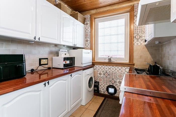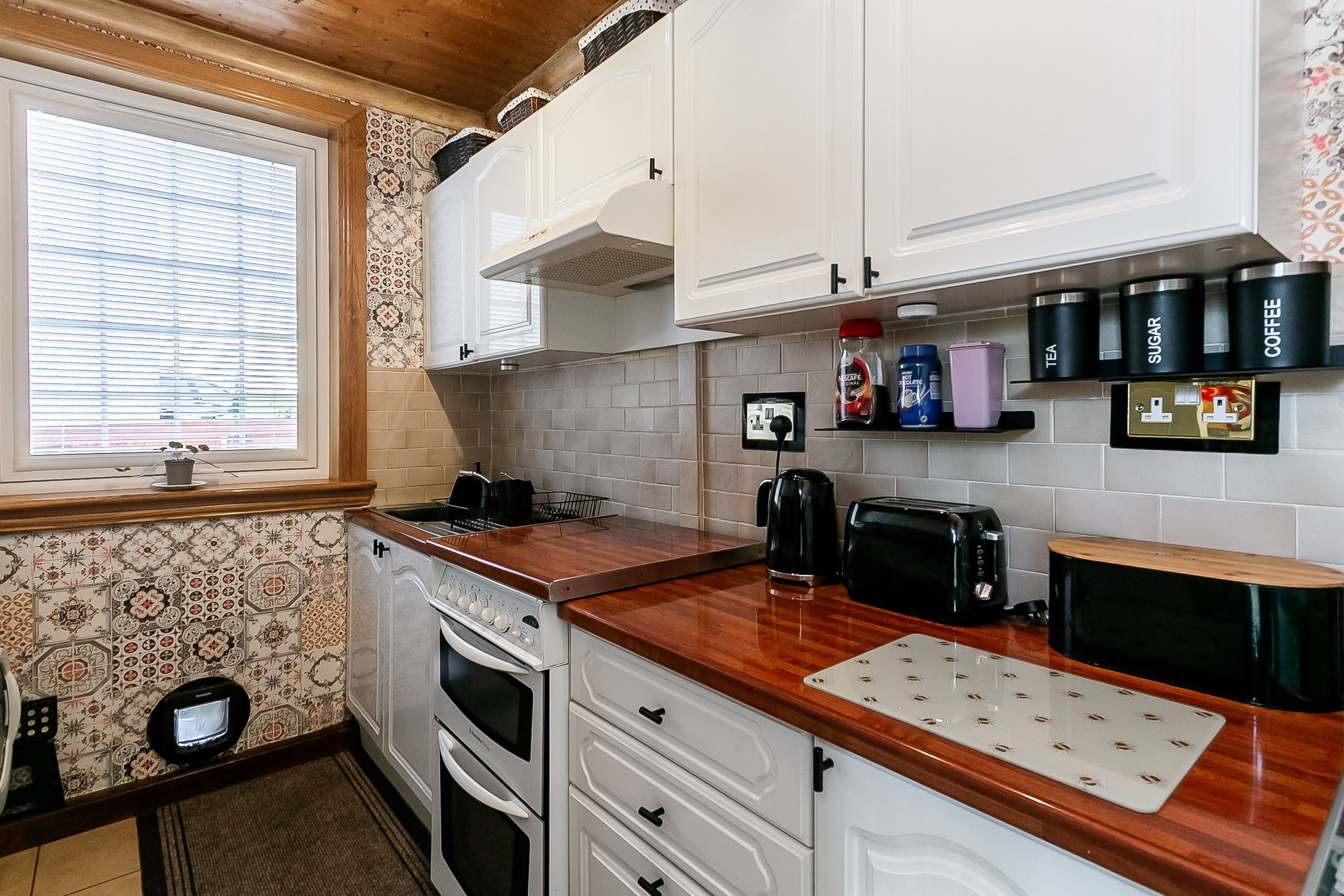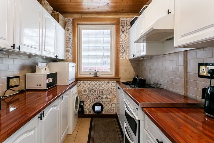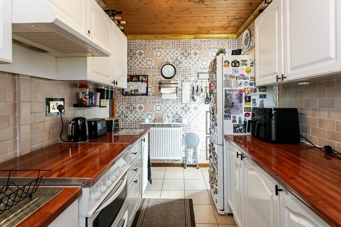 The kitchen is fitted with tiled-effect flooring, wood-effect countertops complemented by a tiled splashback, and includes a stainless steel sink with drainer, a cooker with gas hob, a washing machine, and a fridge/freezer. All bedrooms are finished with contemporary flooring, with bedrooms two and three further benefiting from mirrored sliding wardrobes providing excellent storage, while bedroom one offers additional space for freestanding furnishings.